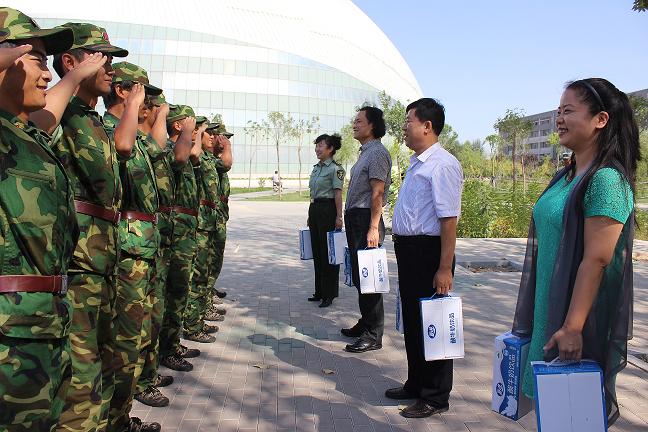 活动中,刘明院长首先代表学院领导和老师做了慰问讲话,刘院长首先对同学们在军训过程中坚强的表现提出肯定,希望同学们借军训之机锻炼自己的身体、磨练自己的意志,学会团结、友爱、协作,最后刘院长对军训师生送去了中秋的祝福。随后,院领导全体领导和老师和军训教官、学生合影留念并为学生发放了中秋节的慰问品。