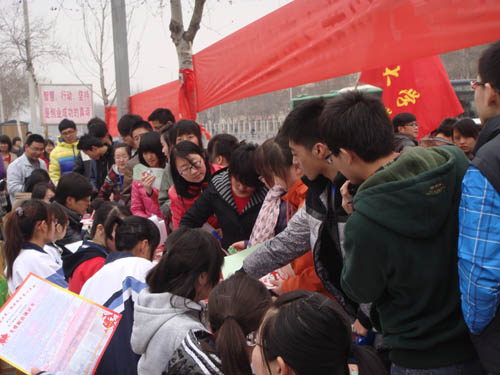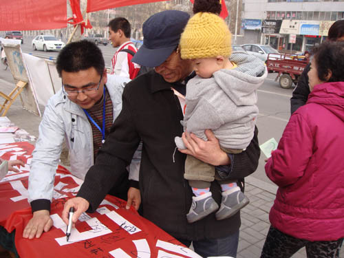 在宣传活动现场,志愿者向路人征集签名,“弘扬雷锋精神参与志愿服务”的条幅旁签名的队伍已排成了一条长龙,其中一位六七十岁的老奶奶,颤抖着在条幅上一笔一划的写上了“余凤姣”这三个字,每一笔每一画中地表达了奶奶对雷锋的崇敬之情。也让我们感到雷锋精神早已成为一种民族精神,融于每个中国人的血脉之中。活动最后,自治区献血站的同志对同学们的行为给予了高度的评价。