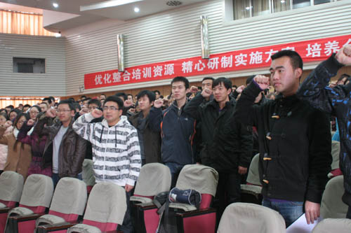 大会在雄壮的国歌声中拉开序幕。会上,赵永军副书记宣读了《物理电气信息学院学生党员目标管理考核办法》。李海燕副书记对本次考核工作做了具体部署并提出明确要求,她总结了一年来学院取得的辉煌成绩,并指出,每一份成绩的获得都倾注着学生党员们的心血和汗水,他们不仅带头参与学校、学院的各级各类比赛,而且还组织参加了各种科技创新竞赛,他们以身作则、争做先锋,不仅为学院争得了荣誉,更锻炼了自己的实践能力。李书记提出,在以后的工作中,学院要坚持把学生的入党前教育和入党后再教育齐抓共管,充分发挥学生党员的模范带头作用,永葆学生党员的先进性。2009级学生李玉东、2010级学生陈龙在大会上代表学生党员发言。