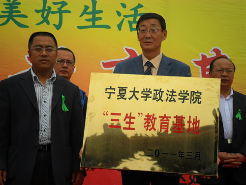 银川市民政局相关领导在仪式上致辞。学院党总支书记李正东向刘国瑞董事长赠予“三生”教育基地牌匾。政法学院院长潘忠宇表示,“三生”教育基地的成立是为提高学院大学生德育教育工作的实效性,提升学生的生命价值观,生活质量和生存能力,拓宽学生生存能力的渠道,拓宽学生身心发展的教育平台。银川市福寿园董事长刘国瑞表示,现代陵园应该是一本浓缩的生命有形教科书,是培育人文精神的场所,也是道德教育潜移默化的特殊环境。