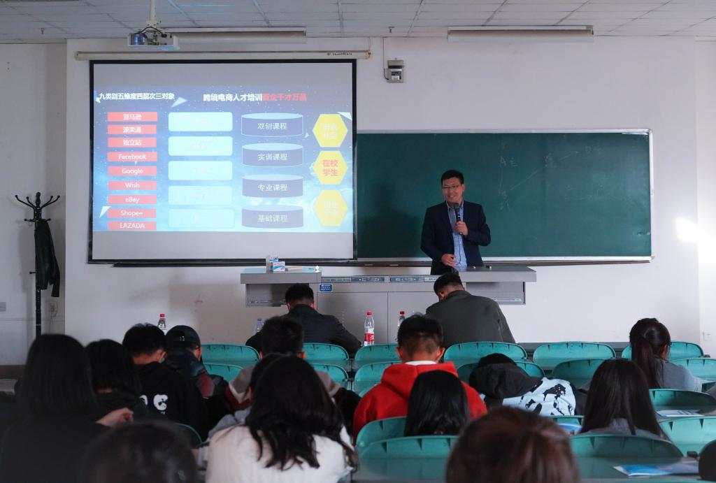 兴庆数字经济产业园凯博电商学院负责人伏芳伟向参加讲座的同学介绍了宁夏跨境电商人才培养平台,并详细解读了培训平台分领域、分层次、分对象、分模块的培训特点。他就平台与学校的合作指出,可以通过共建专业学科的方式促成校企一站式服务流程。对于未来的合作与培训,他还从专业人才、创业团队、品牌、营业额等方面提出预期目标。