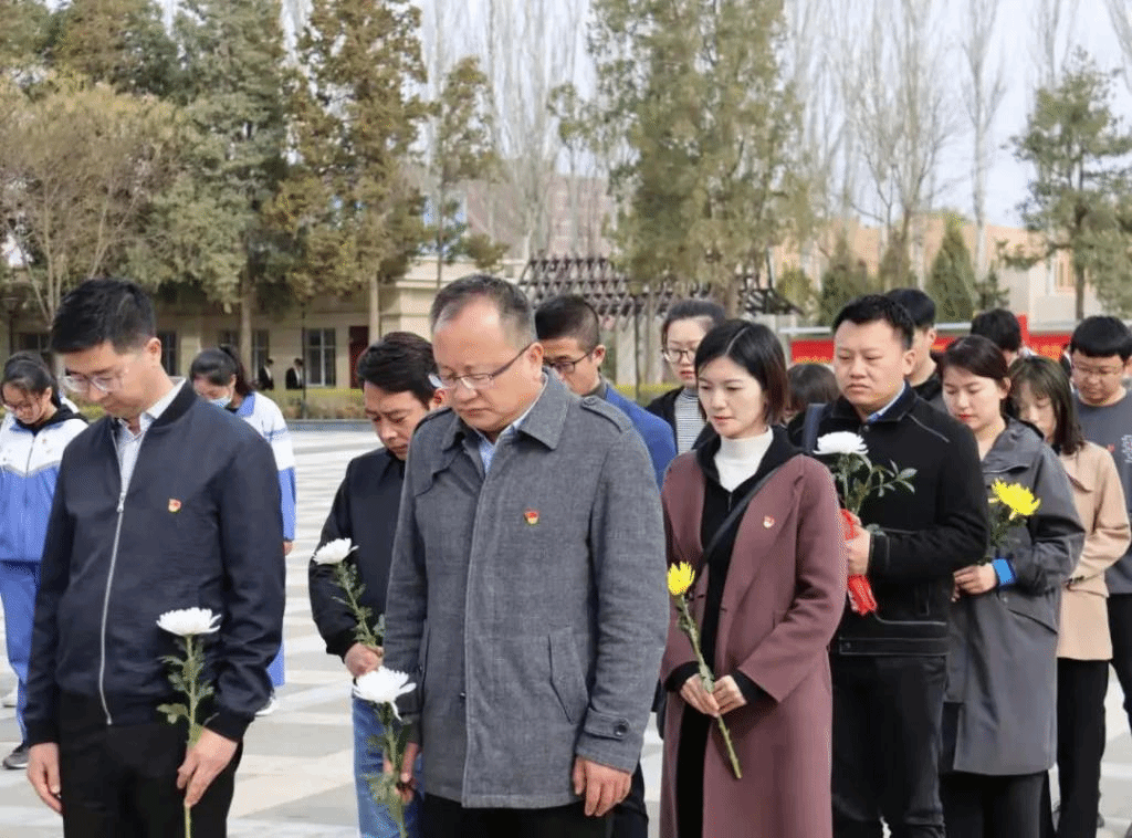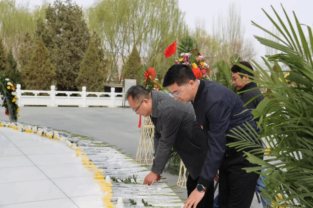 在庄严肃穆的烈士纪念碑前,全体党员整齐列队,庄严肃立,向革命烈士默哀致敬,并敬献花篮鲜花,缅怀革命烈士。