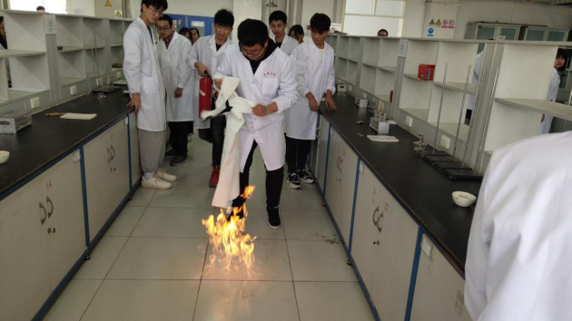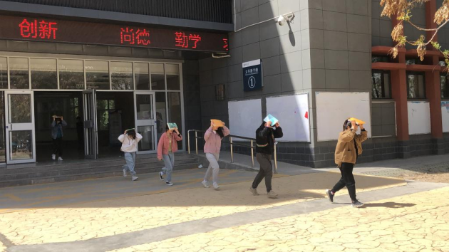 在知化楼325实验室演练现场,警报声响起,现场总指挥发布人工指令:“知化楼实验室发生重大火情,师生立即向外撤离!”实验室的老师迅速引导学生穿戴防毒面具或捂住口鼻,屈身分别从前后门按紧急指示灯向紧急出口疏散。微型消防站队员在接到火警报警后迅速乘车到达知化楼并开始灭火。确认室内无人遗留后,老师紧跟学生队伍离开知化楼,前往紧急疏散集结区域。