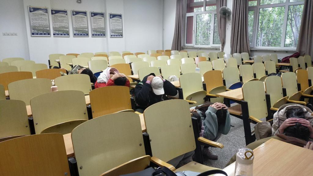在文萃一教演练现场,保卫处处长张守荣宣布演练开始。广播播放警报声模拟首次地震波来袭,正在文萃一教211教室上课的老师听到信号后立即发出指令:“地震来袭,同学们紧急避险。”师生立即选择课桌旁进行避险,并用书本保护头部。在紧急避险60秒后老师提醒:“紧急避险结束,大家迅速向操场疏散。”学生依次从前后门一路靠右经楼道向操场迅速逃生,老师在确认无人遗留后立即跟上撤离队伍,疏散到应急避难场所。到达集结区域后,班委清点人数,辅导员及时上报学生情况。