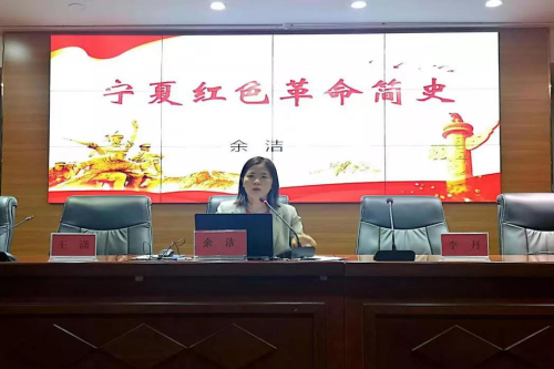 余洁通过“马克思列宁主义在宁夏的传播”、“宁夏第一个特别党支部的诞生”以及“毛泽东同志在宁夏的一夜话、一场仗、一首诗”、“邓小平同志第一次来宁夏”、“毛泽民同志在盐池”等生动史实的解读,使同学们深入地了解了宁夏充满红色记忆的光荣革命历史。她强调,要通过对党史的认真学习,更加深刻地认识到红色政权来之不易、新中国来之不易、中国特色社会主义来之不易,争做知史爱党、知史爱国的有为青年。