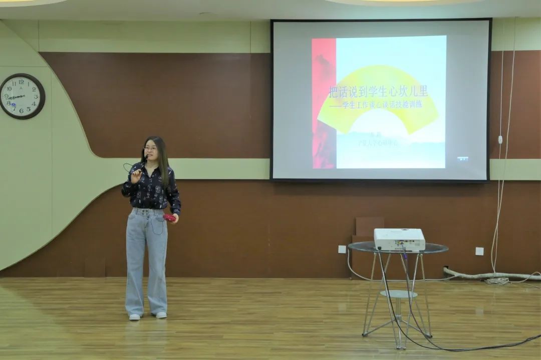 秦莉从“知心”和“谈心”两个要点讲起,指出作为学生心理健康教育队伍工作成员,要培养三个基础能力,即“倾听”、“共情”、“关注”,要学会倾听同学的心理诉求,提高共情能力,进一步拉进与求助者的心理距离,力求顺利解决问题。