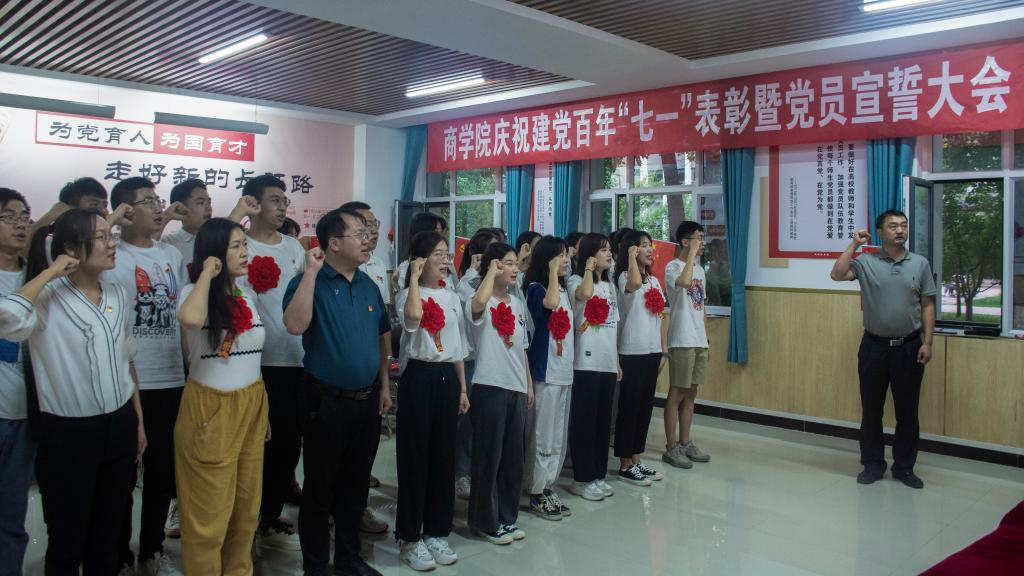 6月28日,商学院党总支召开庆祝建党百年“七一”表彰暨党员宣誓大会。商学院党总支副书记、院长赵军,学院党总支组织委员、教工支部书记、副院长房彦兵,学生党支部书记沈薇,教工支部组织委员万惠,教工支部宣传委员张光旭,学院全体师生党员参加会议,会议由沈薇主持。