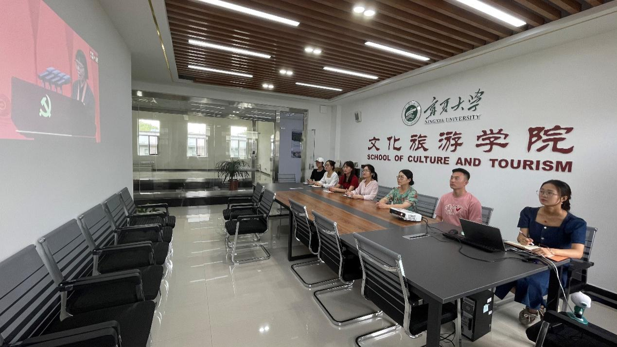 学院党员师生佩戴党徽,饱含敬仰之情,认真聆听29位获得者的先进事迹,氛围庄严融洽。当听到吴忠市利通区金星镇王兰花热心小组党支部书记王兰花数十多年如一日坚持志愿服务时,师生无不为之动容。