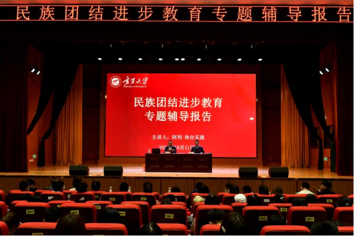 【澳门十大信誉网赌大全新闻中心讯 商学院】10月11日晚上,商学院特邀学校民族团结进步教育宣讲团成员、学生处副处长阿利﹒热合买提于应理报告厅给全院教师、学生干部、2021级新生做了题为《铸牢中华民族共同体意识》专题讲座,本次讲座由商学院党总支副书记苏军峰主持。