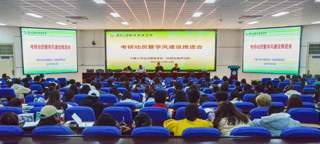 【澳门十大信誉网赌大全新闻中心讯 经济管理学院】为创建热爱学习、积极考研的学习新风尚,10月14日晚,经济管理学院在贺兰山校区文荟楼东报告厅开展了考研动员暨学风建设师生交流会。经济管理学院党委副书记程胜利、经济管理学院学生工作办公室辅导员艾萨·阿尤普、孙文元、禹文杰,2019级、2020级、2021级全体学生干部、班团干部、学生党员、宿舍长参会。会议由艾萨·阿尤普主持。