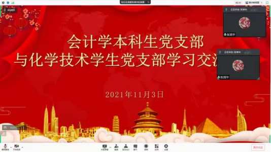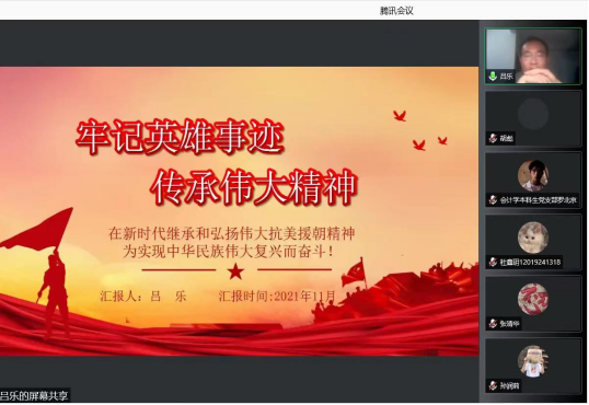 “作为新时代的大学生,在日后的学习工作生活中,我们将紧密团结在以习近平同志为核心的党中央周围,在鲜艳的党旗指引下,在时代的航船上,乘风破浪,直挂云帆,万众一心,众志成城,共同创造我们祖国更加辉煌的明天!”2018级化学技术党支部成员胡彪在交流时说到。会计学本科生党支部孙文元老师表示,本次活动不仅让支部成员了解了辛亥革命与抗美援朝战争的起因和历史背景,更重要的是学习了辛亥革命与抗美援朝战争的精神所在。通过交流会的方式,不断加强同学们的政治理论学习,不断增强两支部的凝聚力和向心力。
