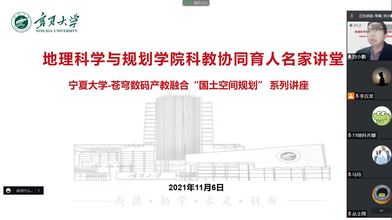 【澳门十大信誉网赌大全新闻中心讯 地理科学与规划学院】11月6日,地理科学与规划学院和苍穹数码技术有限公司联合举办“国土空间规划”系列讲座。讲座邀请了中国地质大学(北京)土地科学技术学院教授吴克宁、武汉珈和科技有限公司创始人兼CEO冷伟、苍穹数码技术股份有限公司苍穹规划设计研究院孙文军和苍穹数码技术股份有限公司黄俊等专家开展系列活动。学院院长刘小鹏主持讲座,苍穹数码技术有限公司西北大区总经理李琳评议。