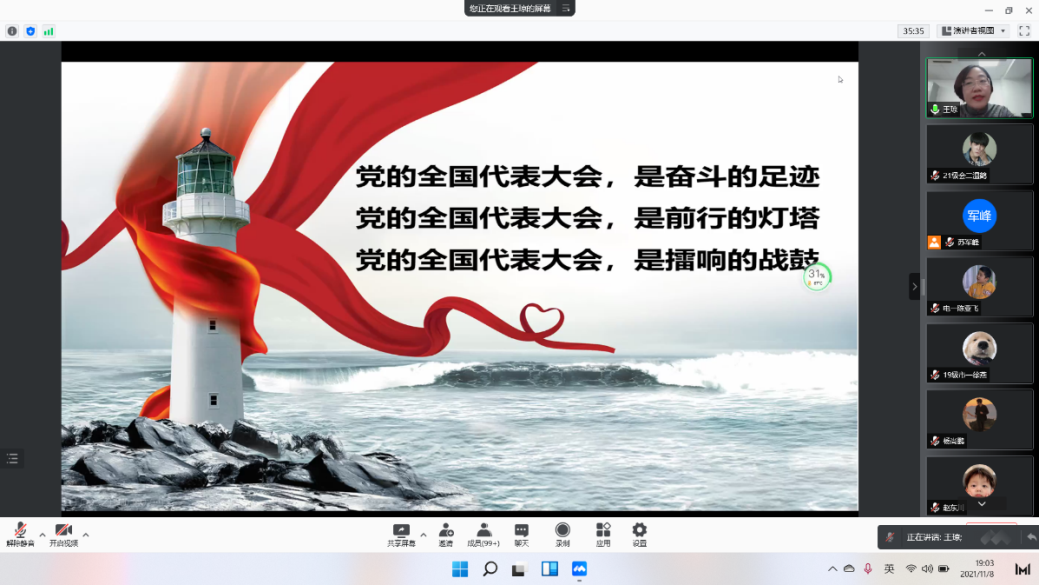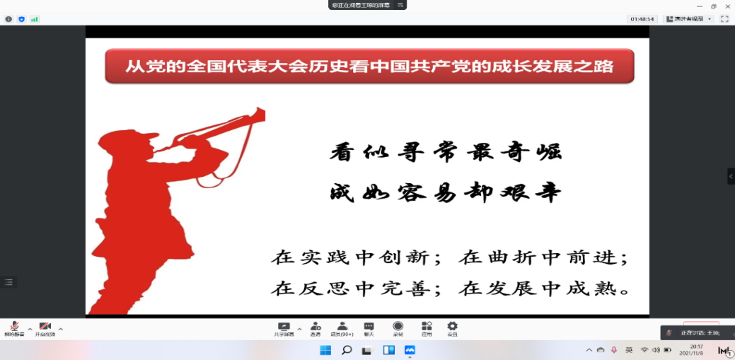 王琼主任结合习近平总书记“七一”重要讲话精神,以党的历次全国代表大会为主线,用丰富的事例、生动的语言,深入解读了一百年来中国共产党以实现中华民族伟大复兴为己任,团结带领中国人民实现了中华民族从站起来、富起来到强起来的伟大飞跃。整场讲座集政治性、理论性、思想性和故事性于一体,使大家真切感受到中国共产党从小到大、从弱到强的艰辛发展历程,彰显出一代代共产党人不畏艰难、勇于牺牲、接力奋斗的高贵品质。