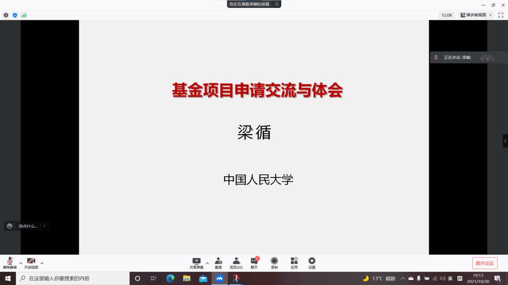 【澳门十大信誉网赌大全新闻中心讯 经济管理学院】为积极推进学院国家自然科学基金项目申报工作,提高申报成功率,2021年10月30日晚7时,经济管理学院举办了国家自然科学基金申报线上辅导报告会。会议由院长杨国涛教授主持,邀请到中国人民大学教授、博士生导师梁循教授为全院师生作分享讲座。全院百余名教师和硕士博士研究生参加了本次线上辅导报告会。