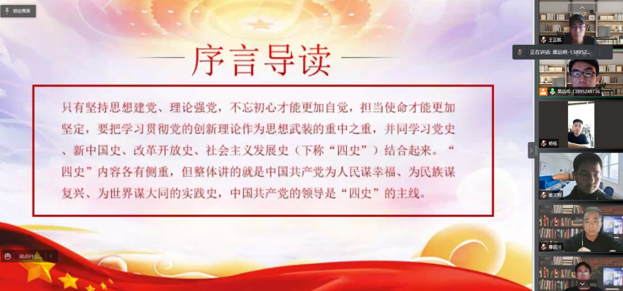 “抗疫志愿者”临时党支部开展“四史”学习主题党日活动,支部书记栗远明介绍了“四史”的内涵,并带领同志们重温了中国共产党百年光辉历程中的重大事件,支部党员们就学习“四史”的心得作了交流发言。马明同学表示,通过对中国共产党百年光辉历史的重温和回顾,我们感慨时代与人民力量的同时,对中国共产党的钦佩之情油然而生,更加坚定了理想信念。学习党史、新中国史、改革开放史和社会主义发展史是新时代青年的必修课,让我们在发展的道路上不忘初心、牢记使命、以史为鉴、砥砺前行。