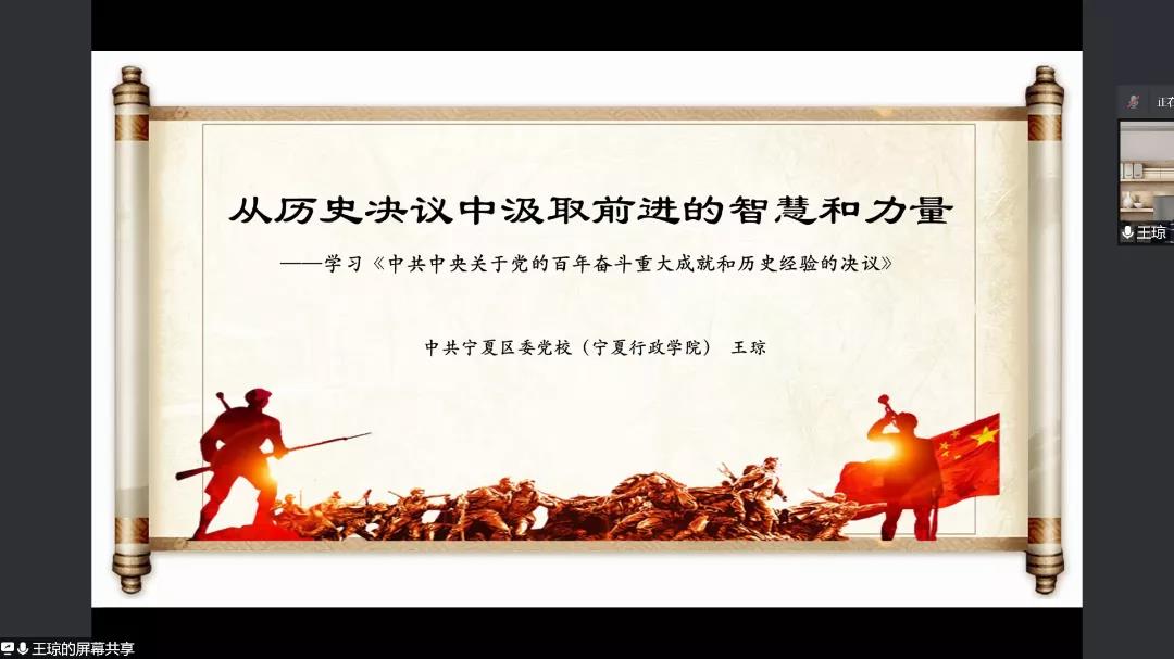 王琼强调,善于总结历史经验教训,不断从中汲取历史智慧,是中国共产党的一条十分重要的成功经验。在建党百年之际,全面总结党的百年奋斗重大成就和历史经验,是郑重的历史性、战略性决策,体现了我们党重视和善于运用历史规律的高度政治自觉,体现了我们党牢记初心使命、继往开来的自信与担当。她从“登高望远:深刻领悟历史决议的制定背景”、“兼知往来:全面理解历史决议的叙事逻辑”、“以知促进:贯通把握历史决议的多重定位”三方面为大家解读中国共产党的历史经验与成长史。