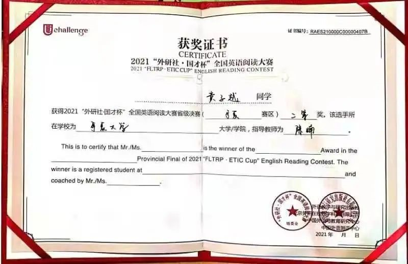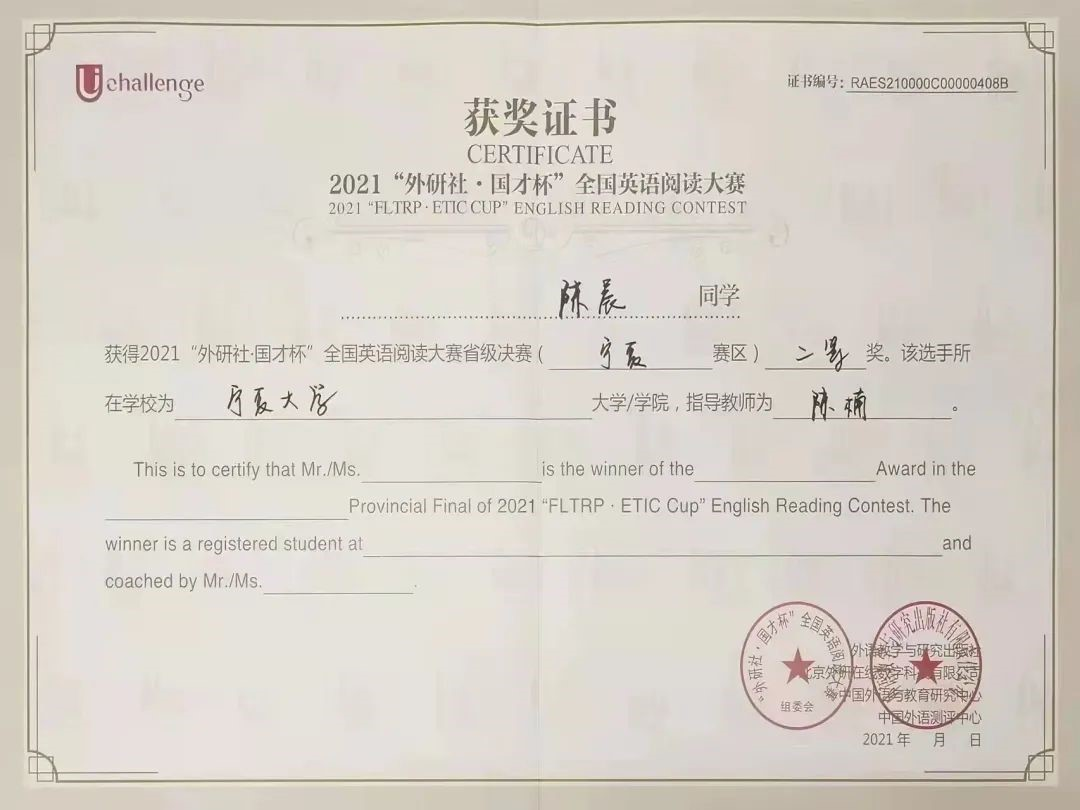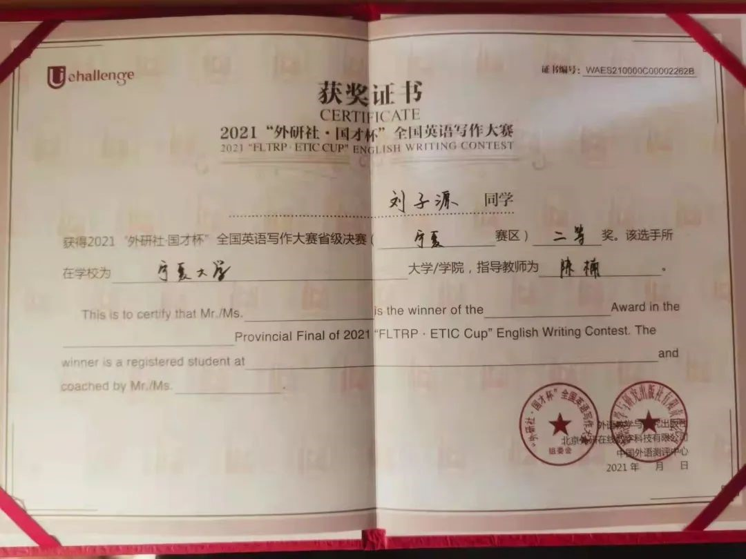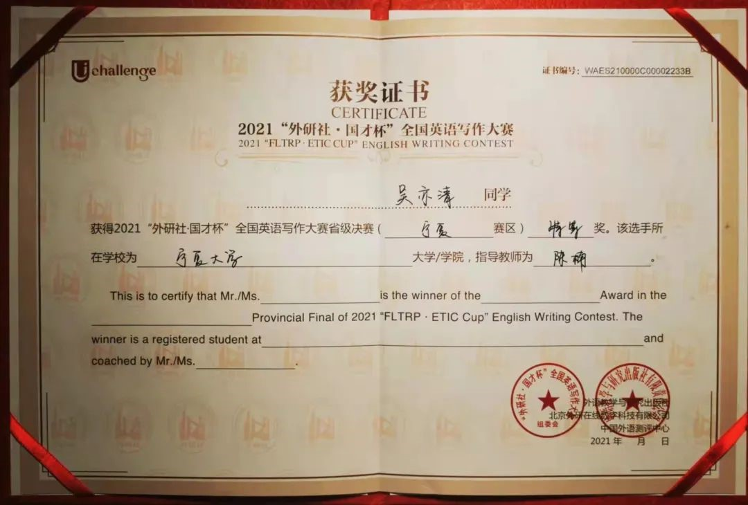 在全国赛中,吴亦清同学代表澳门十大信誉网赌大全参加此次2021“外研社·国才杯”全国英语写作大赛全国总决赛,成功斩获三等奖。在宁夏赛区,吴亦清同学获得了2021“外研社·国才杯”全国英语写作大赛省级决赛(宁夏赛区)特等奖;刘子源同学则获得了2021“外研社·国才杯”全国英语写作大赛省级决赛(宁夏赛区)二等奖;邵新淼、黄子越、陈晨三位同学均获得了2021“外研社·国才杯”全国英语阅读大赛省级决赛(宁夏赛区)二等奖。