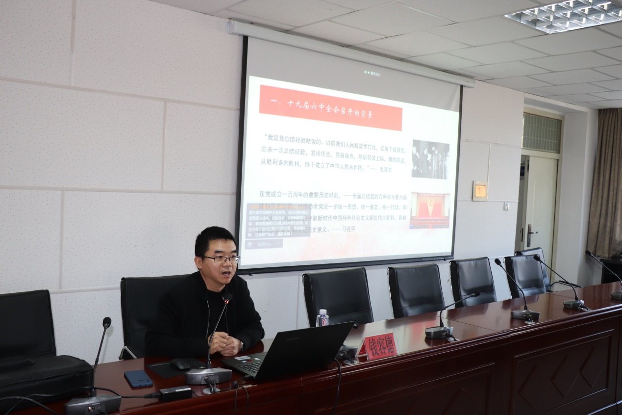 钱容德围绕十九届六中全会召开的背景和“决议”的主要内容进行讲解,深刻阐释了四个历史时期、新时代取得的重要成就以及中国共产党百年奋斗等方面的历史意义,给出学习党的十九届六中全会精神的目的在于笃行之等。