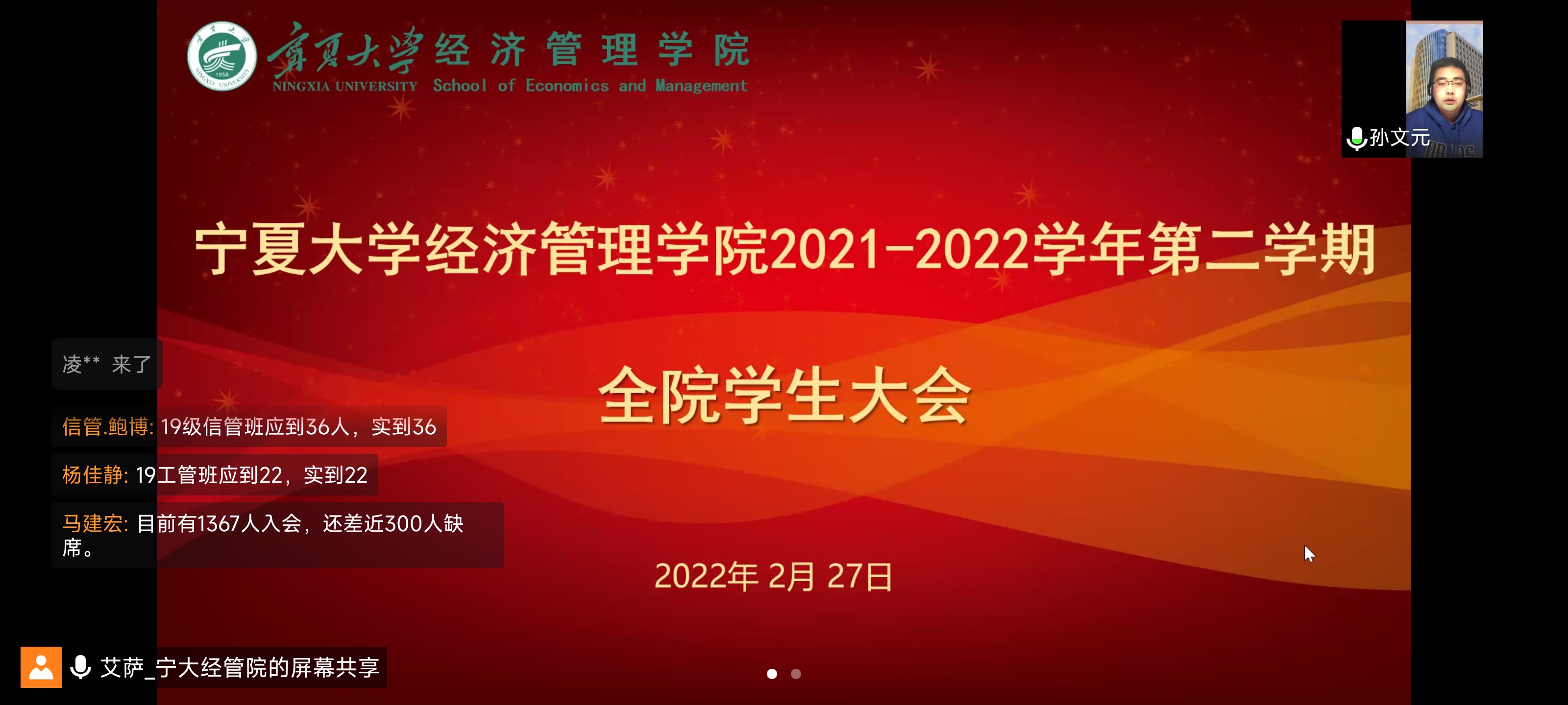 【澳门十大信誉网赌大全新闻中心讯 经济管理学院】2月27日晚,经济管理学院在线上举行了年级大会。学院党委副书记马建宏,学院学生工作办公室主任黄旭兴,学院研究生辅导员郭飞、杨波,学院本科生辅导员艾萨·阿尤普、孙文元、禹文杰出席本次会议。经济管理学院全体学生参加本次会议。本次会议由艾萨·阿尤普主持。