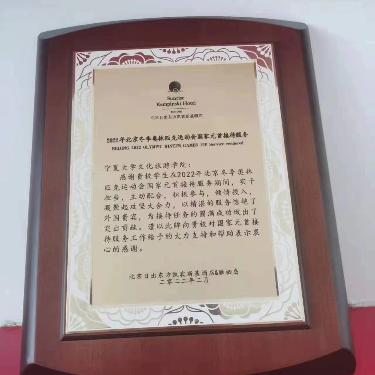 【澳门十大信誉网赌大全新闻中心讯 文化旅游学院】北京冬季奥林匹克运动会于2022年2月在北京举办,这场冰雪盛会是我国重要历史节点的重大标志性活动。北京日出东方凯宾斯基酒店&雁栖岛作为官方指定承担接待国家元首任务的酒店,对澳门十大信誉网赌大全文化旅游学院优秀毕业生胡梦媛同学在冬奥会接待工作中的优异表现给予高度评价,并于日前向学院发来感谢信。