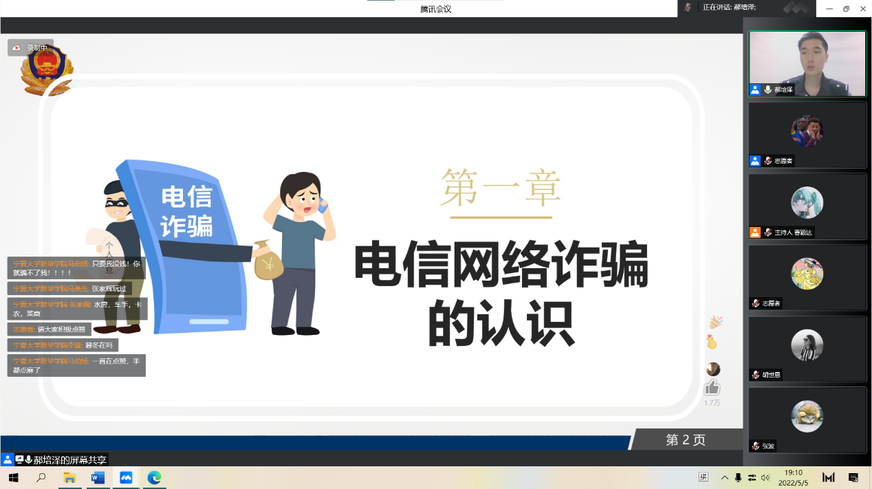 本次课程由银川市公安局反诈宣讲民警郝培泽担任主讲,通过介绍2021年以来常见高发的十二类电信网络诈骗,运用典型案例,通过播放案例视频等方式深入讲解了电信网络诈骗的主要种类、惯用手段、危害及防范措施,让广大同学更加清醒地认识到防范网络电信诈骗的重要性和紧迫性。