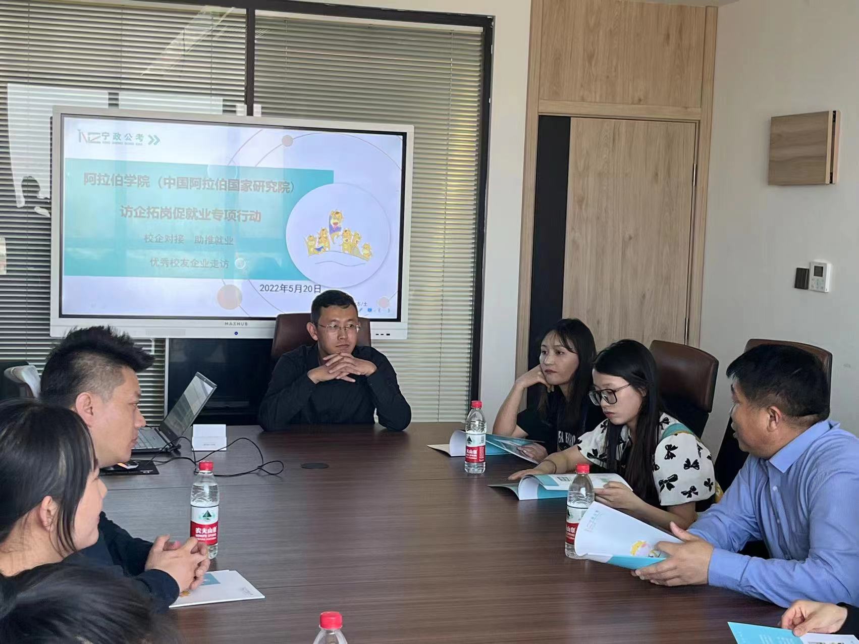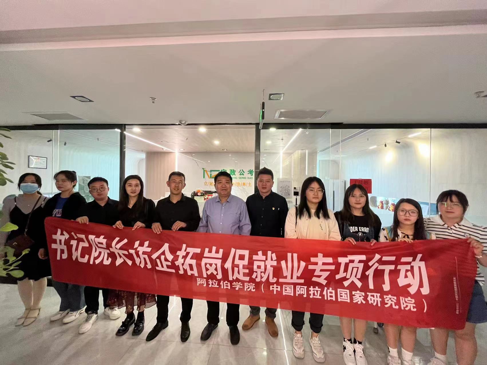 【澳门十大信誉网赌大全新闻中心讯 阿拉伯学院】5月20日下午,阿拉伯学院党总支副书记赵永军带领阿拉伯学院(中国阿拉伯国家研究院)学办工作人员、班主任、2022届未就业毕业生代表赴宁政公考开展访企拓岗促就业调研活动。阿拉伯学院2013届优秀校友、宁夏阿加德米学园教育科技有限公司董事长李聚宝与调研组一行进行了深入交流。