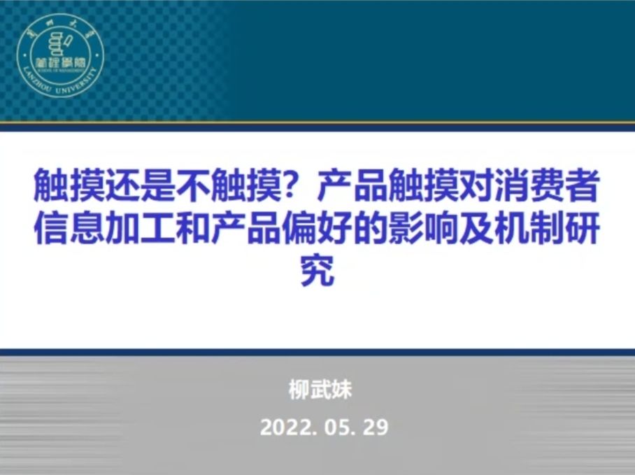本次讲座包含“我的消费者触觉研究简介”、“触摸产品对消费者产品属性加工和偏好的影响”及交流互动三个环节。在对“我的消费者触觉研究简介”的讲解中,柳武妹引入“触觉”及“消费者触觉”的定义,通过对实体购物和虚拟购物中的产品触觉的介绍,表明了触摸在购物过程中的重要性。柳武妹通过论文介绍和文献综述的方式,从研究背景、文献回顾、假设推演、理论模型、研究总览、审稿意见及回馈、修改版本等七个方面为大家讲解了“触摸产品对消费者产品属性加工和偏好的影响”,并通过将实验所研究的自变量和因变量之间的中介、实验数据结合自身的亲身体验,为大家讲解了触摸产品对消费者产品属性和偏好的巨大影响。