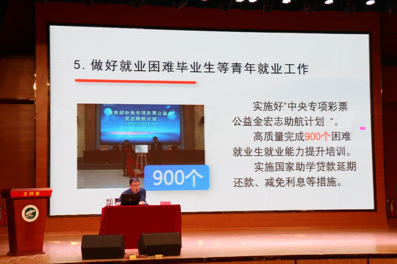 王思旭就《关于切实做好高校毕业生等青年就业创业工作若干政策措施》进行解读;他从鼓励高校毕业生等青年到达企业就业、支持高校毕业生等青年创新创业、引导高校毕业生等青年到基层就业、强化高校毕业生等青年就业创业服务四大主要政策对当前高校毕业生就业形势进行了深入分析,对我市出台的促进高校毕业生就业创业的有关政策进行了详细解读,使同学们充分了解重要就业优惠政策相关信息。