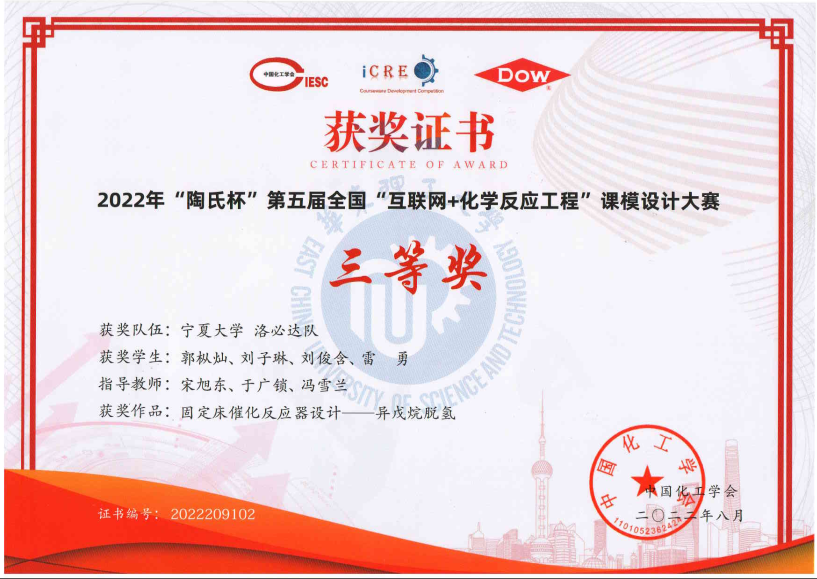 【澳门十大信誉网赌大全新闻中心讯 化学化工学院】8月23日,由中国化工学会主办,华东理工大学承办的2022年“陶氏杯”第五届全国“互联网+化学反应工程”课模设计大赛落下帷幕,在指导教师冯雪兰、宋旭东等的带领下我院“洛必达队”和“苦思冥想的气化炉”两支队伍荣获全国三等奖。