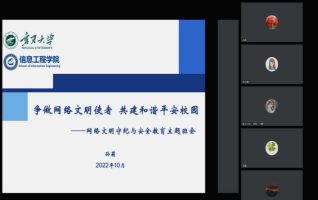 【澳门十大信誉网赌大全新闻中心讯 信息工程学院】为全面构建“三全”育人体系,落实澳门十大信誉网赌大全中层以上领导干部“到学生中去”工作要求,扎实有效推进我院“七进一交友”工作落实落细,我院于10月21日至23日线上开展“争做网络文明使者,共建和谐平安校园”主题班会。学院全体院领导班子、辅导员、班主任分别走进2019级、2020级、2021级及全体研究生班级参加主题班会,院领导班子分别为各班级学生做网络文明与安全主题讲座,学生谈感悟、收获。主题班会由各年级辅导员主持。