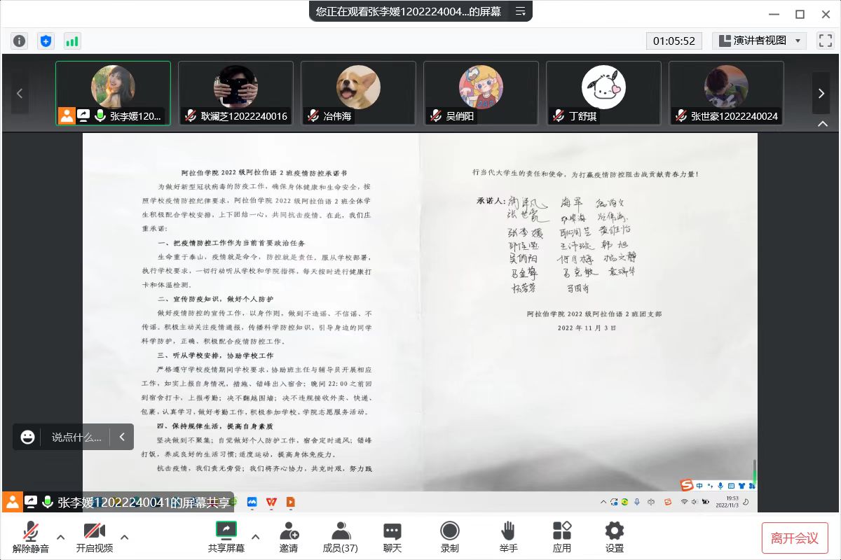 同学们集体学习了党的二十大报告时代背景、重要意义等相关内容,4名入党积极分子同学进行了专题交流发言,并观看了班级干部制作的“致敬抗疫英雄”材料,学习了学校、学院疫情防控会议精神及各项制度、纪律,主持人宣读了班级疫情防控承诺书,同学们积极响应,踊跃签名。在观看完学校师生“同心战疫 共克时艰”的感人照片后,大家纷纷表示,要严格遵守学校疫情防控纪律,积极参加志愿服务。参加活动的老师们分别结合自己学习党的二十大报告分享了自己的心得体会、参加学校疫情防控青年突击队的亲身经历、就当代青年如何努力践行“请党放心 强国有我”的青春宣言等方面与同学们进行分享。