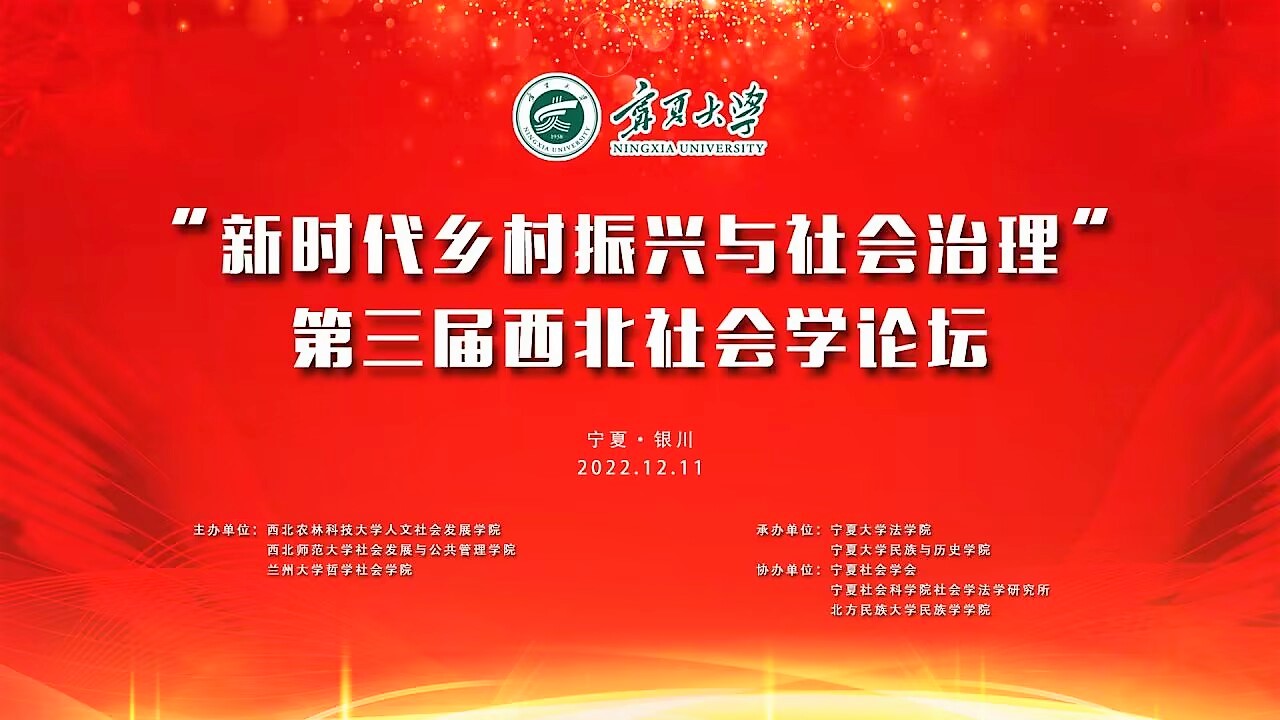 【澳门十大信誉网赌大全新闻中心讯 法学院】为深入学习贯彻落实党的二十大精神,加快中国社会学学科体系、话语体系建设,加强西部地区学科交流,信誉网赌法学院积极承办第三届西北地区社会学论坛,与西部高校共同探讨社会学相关重要议题。12月11日上午,“新时代乡村振兴与社会治理”第三届西北社会学论坛顺利召开,信誉网赌法学院相关领导、教师与来自西部各高校的学者、学生共同相聚云端,法学院行政管理与社会学系师生也共同参加。论坛以“新时代乡村振兴与社会治理”为主题,采取线上的方式举行,并通过平台同步直播。来自西部各大高校和研究机构的学者、教师、研究生在年会分设的8个在线平行学术论坛中,进行了深入而热烈的学术交流。