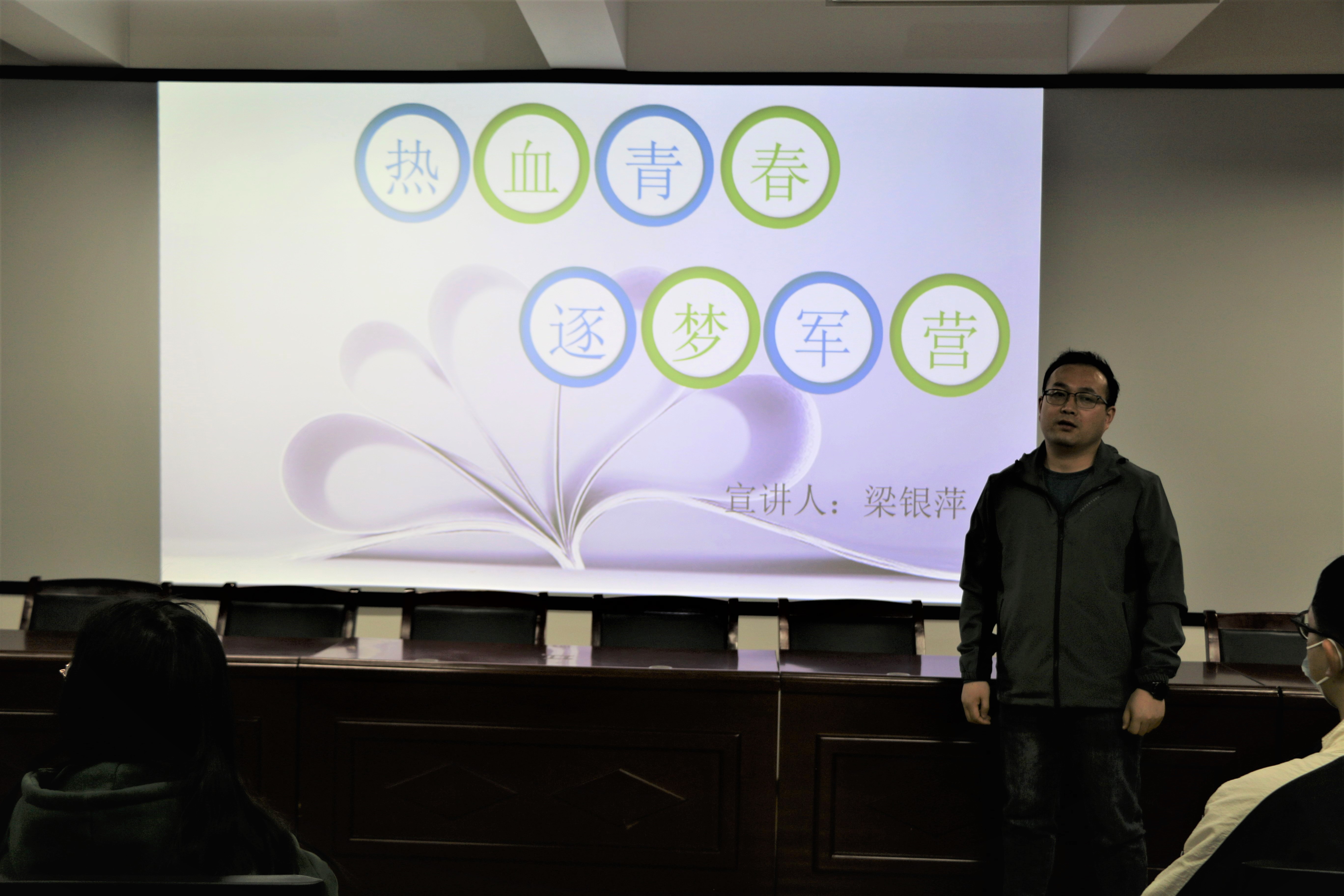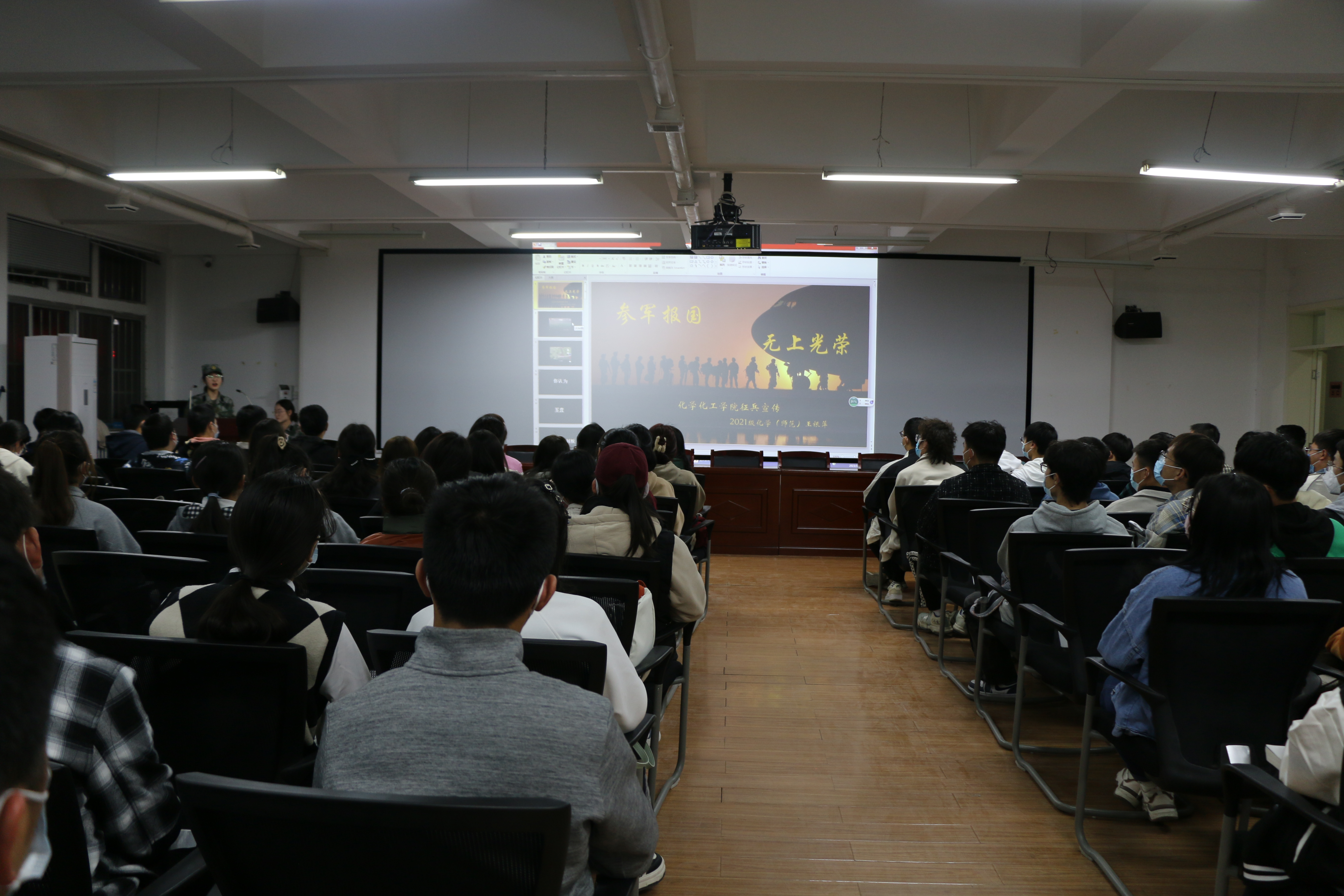 梁银萍从自身经历出发,向同学们分享军营的生活。她勉励同学们在大学四年生活中,要以严谨踏实的作风要求自己,心怀正义帮助他人,面对困难勇挑重担,书写好自己的人生乐章。王银萍以视频、照片的形式,展示了现代军旅生活。
