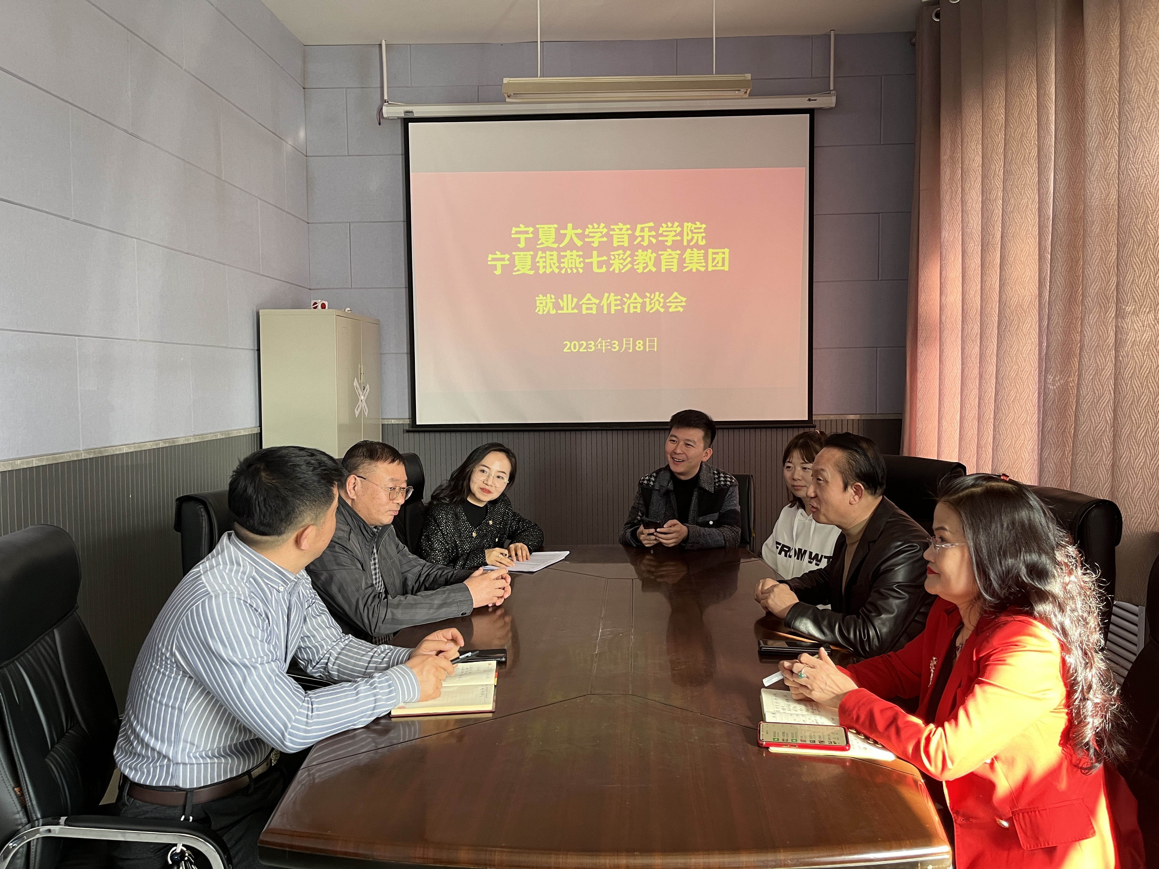 【澳门十大信誉网赌大全新闻中心讯 音乐学院】为积极响应学校关于开展2023届毕业生春季促就业攻坚行动,抢抓春招关键期,全力攻坚促就业。3月8日,音乐学院与宁夏银燕七彩教育集团举行就业合作洽谈会,并针对2023届毕业生举办“银燕七彩”专场招聘宣讲会。音乐学院院长雷兴明,学院党委副书记贾述道,宁夏银燕七彩教育集团董事长朱宝全,总校副校长王声明等人参加了本次洽谈及宣讲会。