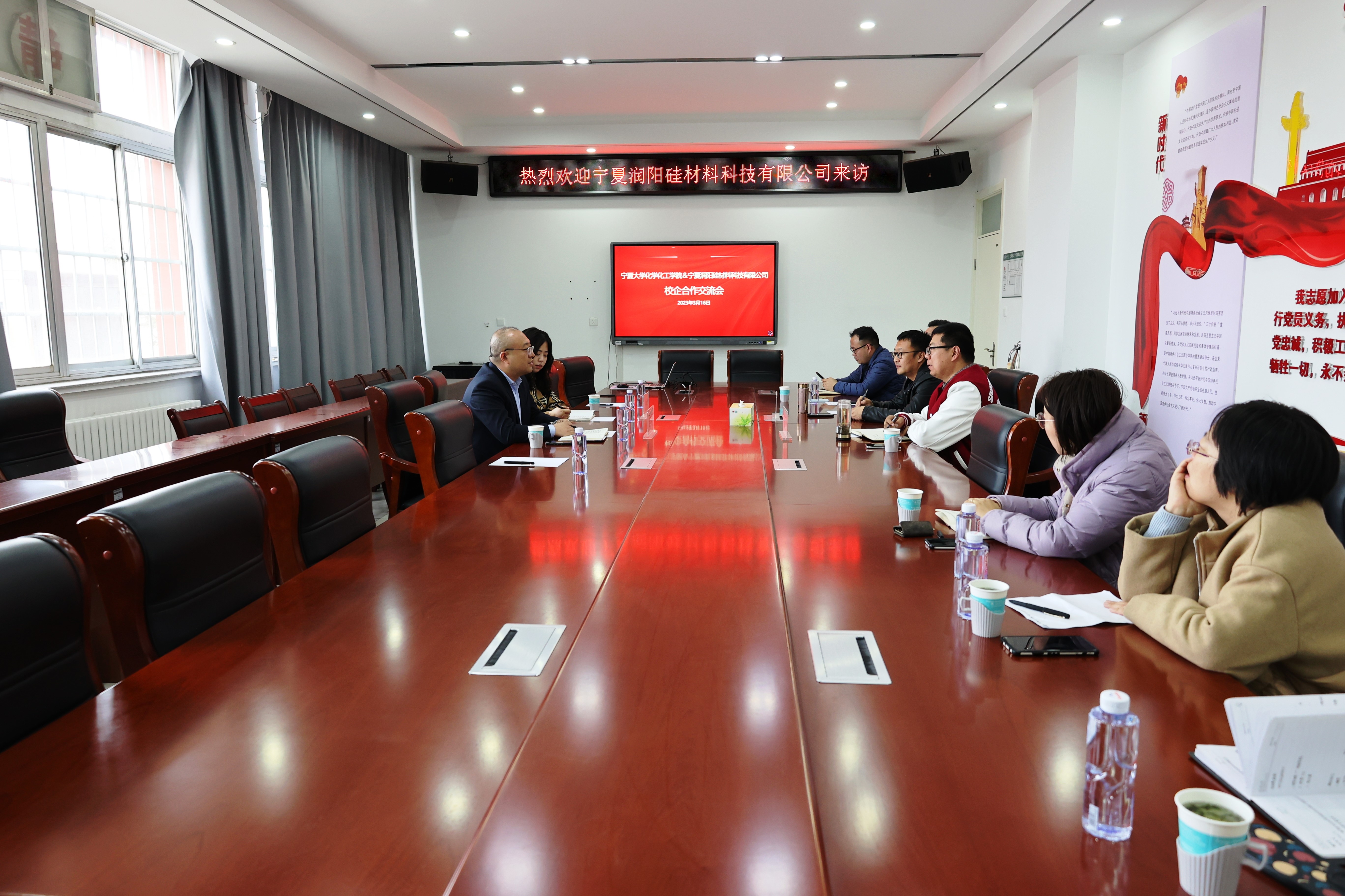 张鹏飞对宁夏润阳硅材料科技有限公司副总经理霍福科一行表示热烈欢迎。他介绍了学院近年来的发展、学科专业建设情况,着重介绍了学院与单位开展校企合作的思路模式,希望通过不断交流与宁夏润阳硅材料科技有限公司在产学研合作、学生实习实训、毕业生就业等方面建立长效稳定的合作局面。