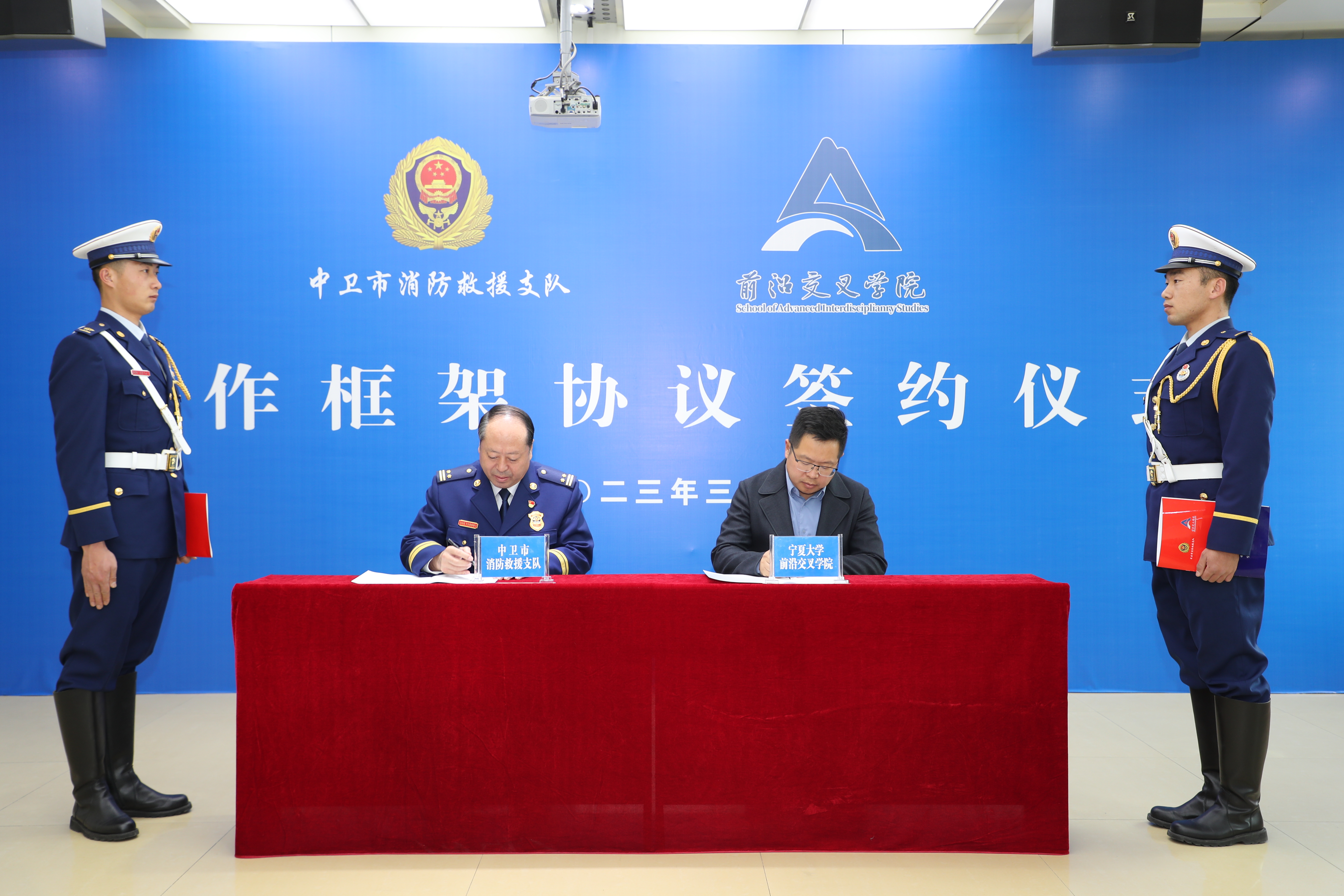 【澳门十大信誉网赌大全新闻中心讯 前沿交叉学院】为深入贯彻落实全国消防救援队伍人才工作会议精神,全面加强高校与消防救援队伍的有机融合,3月22日下午,前沿交叉学院与中卫市消防救援支队举行合作框架协议签约仪式。支队党委书记、政治委员逯恒,党委副书记、支队长武秀宏,学院党总支书记任磊,执行院长王磊、对外合作与交流办公室主任房彦兵、综合办公室主任贾随生出席仪式。学院师生代表和支队机关各科室负责人、基层指战员代表参加仪式。