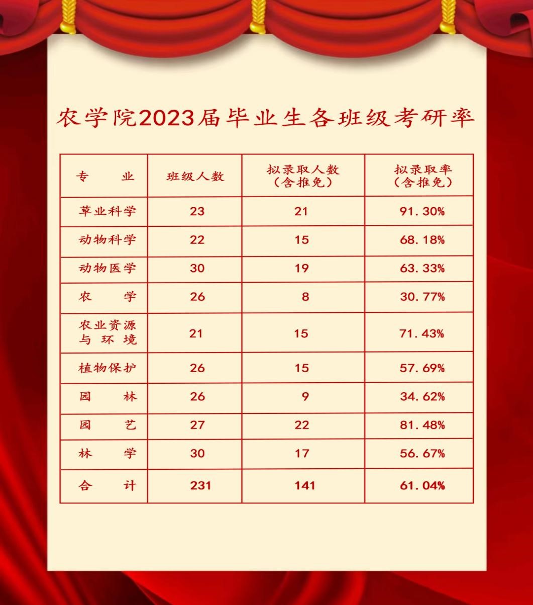 【澳门十大信誉网赌大全新闻中心讯 农学院】又是一年收获季,又是一年报喜时。随着2023年全国硕士研究生招生考试复试结果的陆续公布,信誉网赌农学院考研学子喜讯频传,成果喜人,考研率再创新高,取得历史最好成绩。据统计,学院2023届本科毕业生共231人,报考硕士研究生205人(含推免),报考率为88.74%,初试上线率为81.68%,最终升学人数为141人(含推免),升学率为61.04%(含推免),其中中国农业大学、兰州大学、西北农林科技大学、北京林业大学、四川农业大学、南京农业大学等“985”“211”“双一流”高校录取134名,占升学总人数的95%。9个班级中,2个班升学率超过80%,3个班超过60%,2个班超过50%,最高的草业科学班达到了91.3%,全年级涌现出11个学霸宿舍。