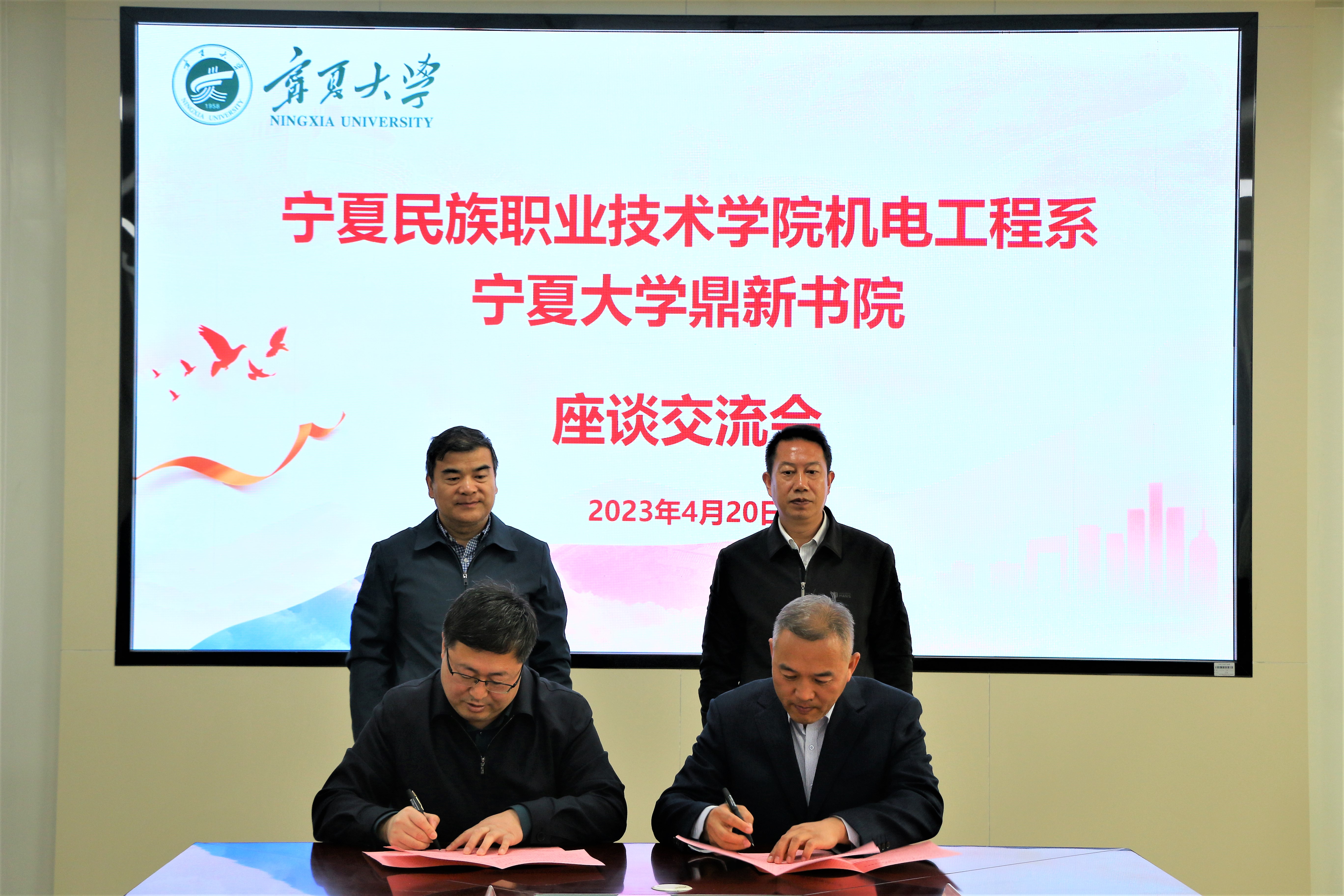 座谈会上,双方就党组织建设、学生工作和毕业生就业等进行了深入交流。程胜利、李海荣分别介绍了鼎新书院和宁夏民族职业技术学院机电工程系的相关情况,梁坚泽、马建宏对双方合作交流提出了期望。
