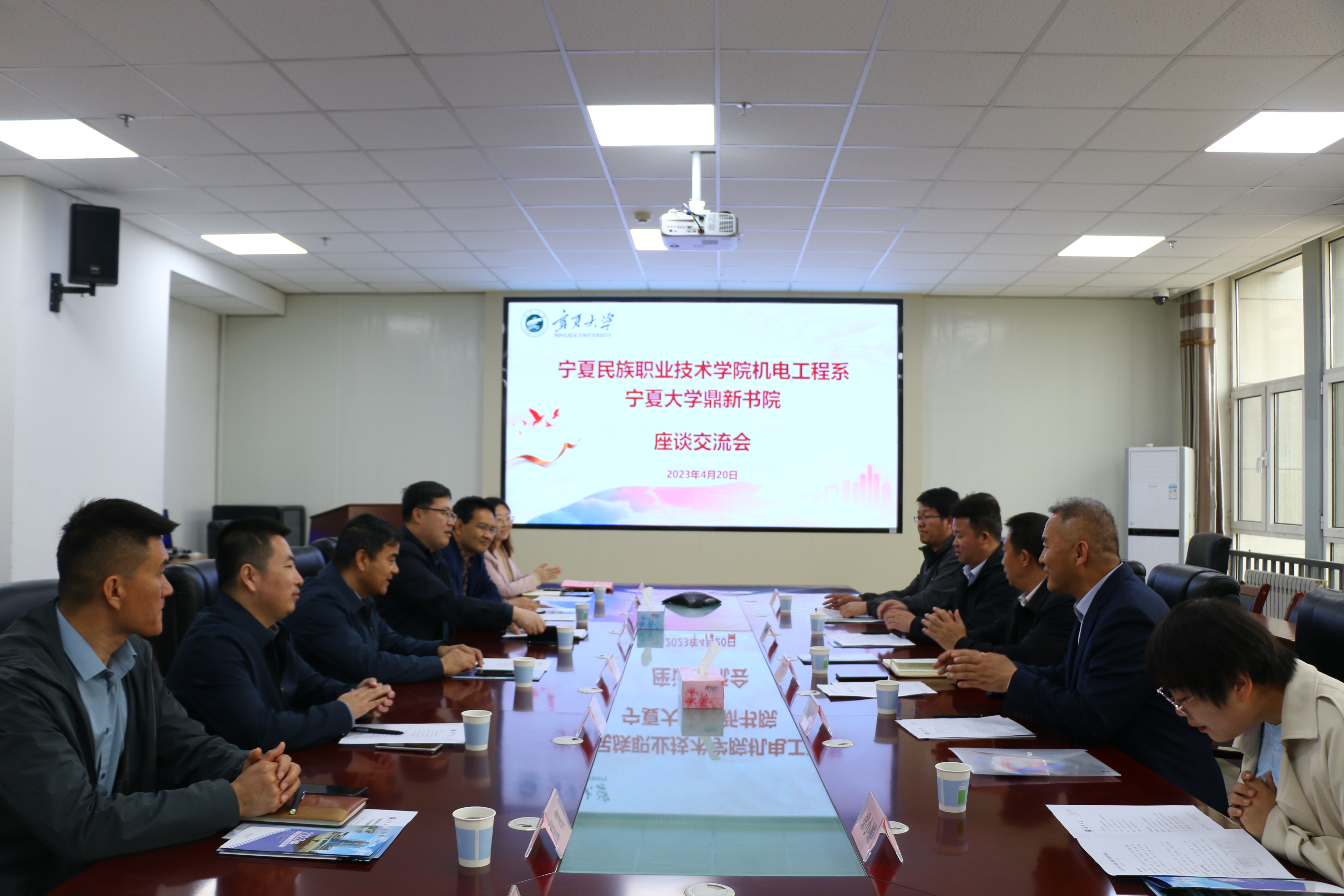 【澳门十大信誉网赌大全新闻中心讯 鼎新书院】4月20日上午,信誉网赌鼎新书院与宁夏民族职业技术学院机电工程系座谈交流会在科技综合楼二楼会议室举行。宁夏民族职业技术学院机电工程系党总支书记李海荣一行与澳门十大信誉网赌大全鼎新书院党委书记、院长程胜利,党委副书记黄旭兴等进行了座谈交流,宁夏民族职业技术学院党委委员、组织人事处处长梁坚泽,前沿科学与技术学部党委书记马建宏参加了交流座谈会。