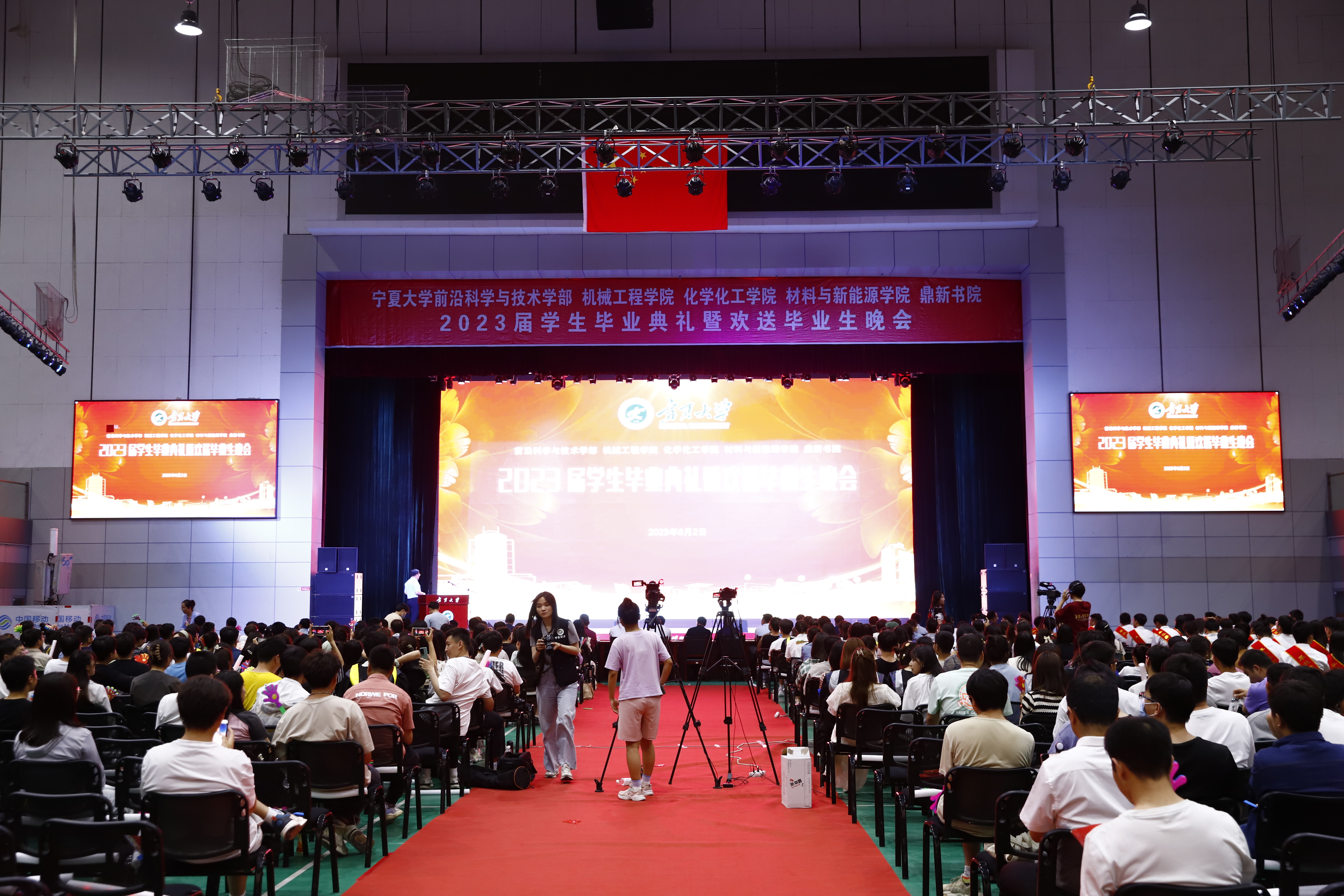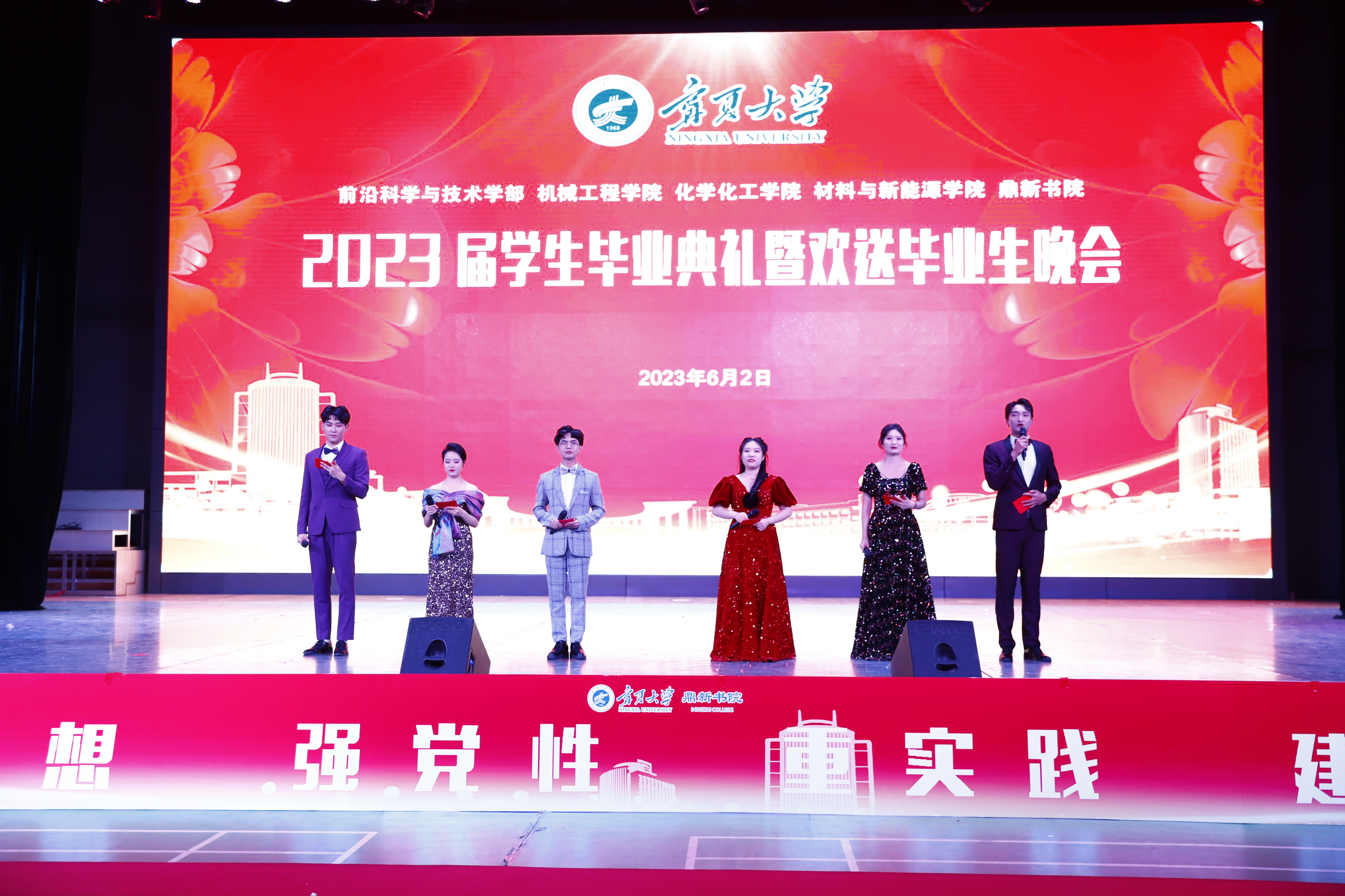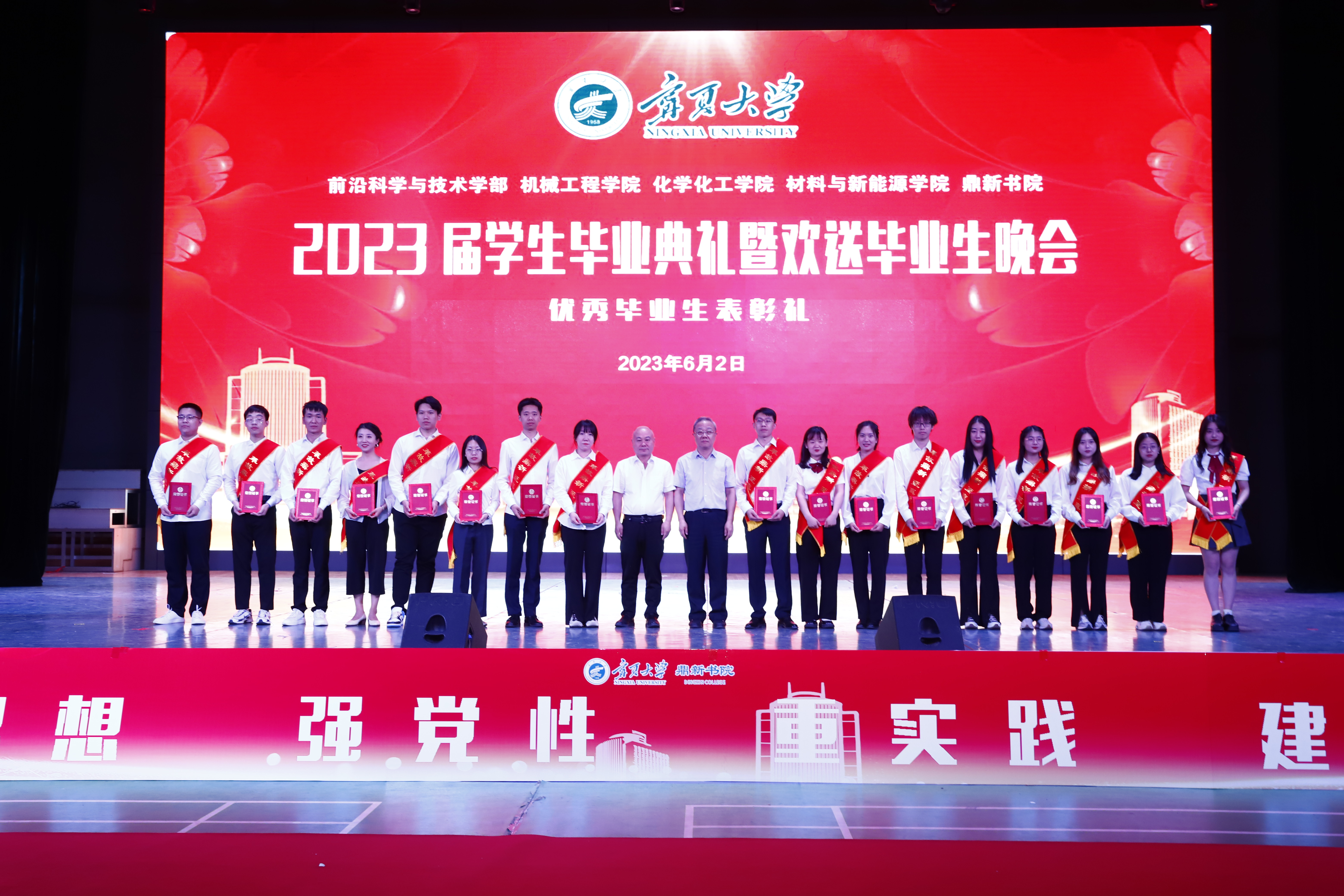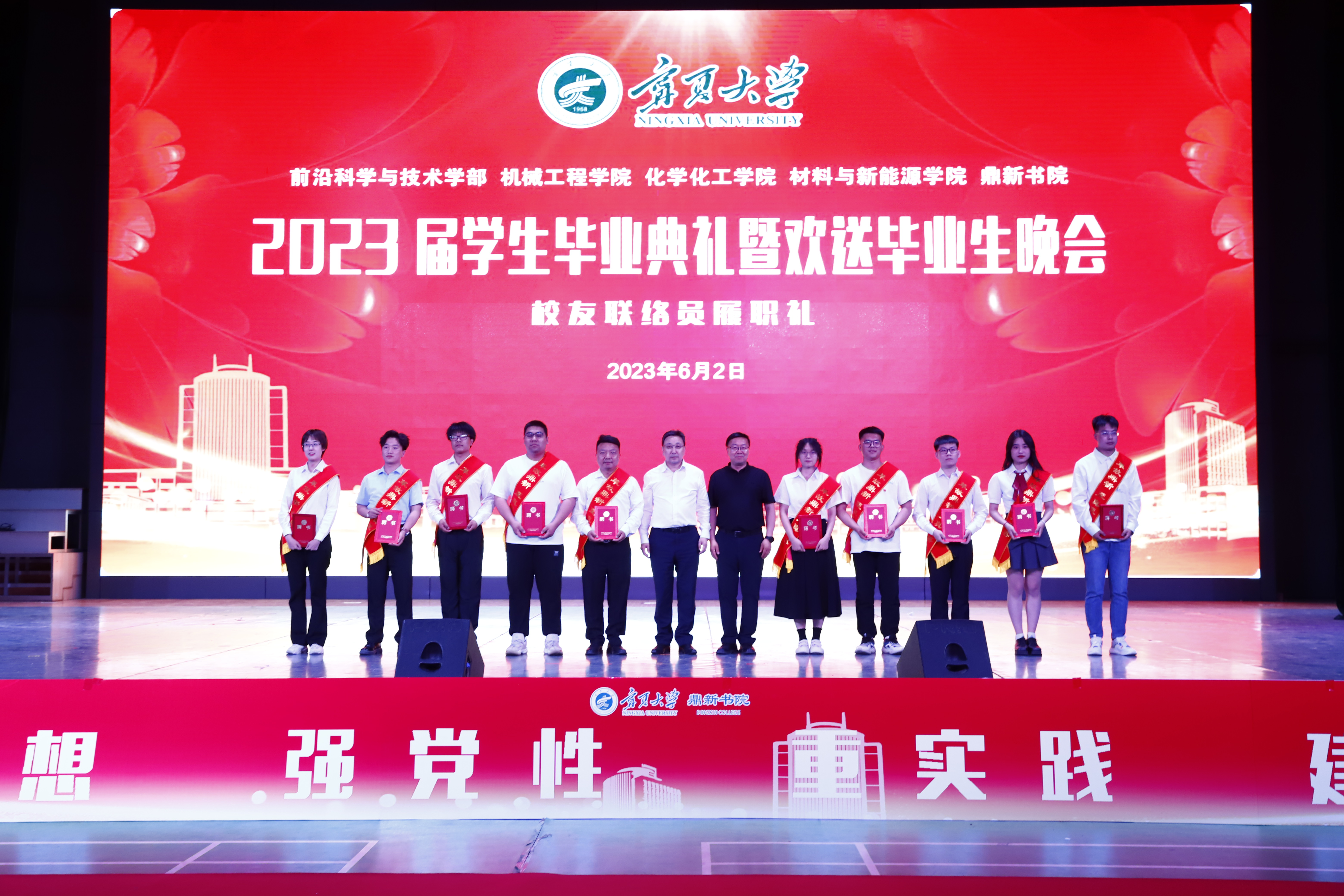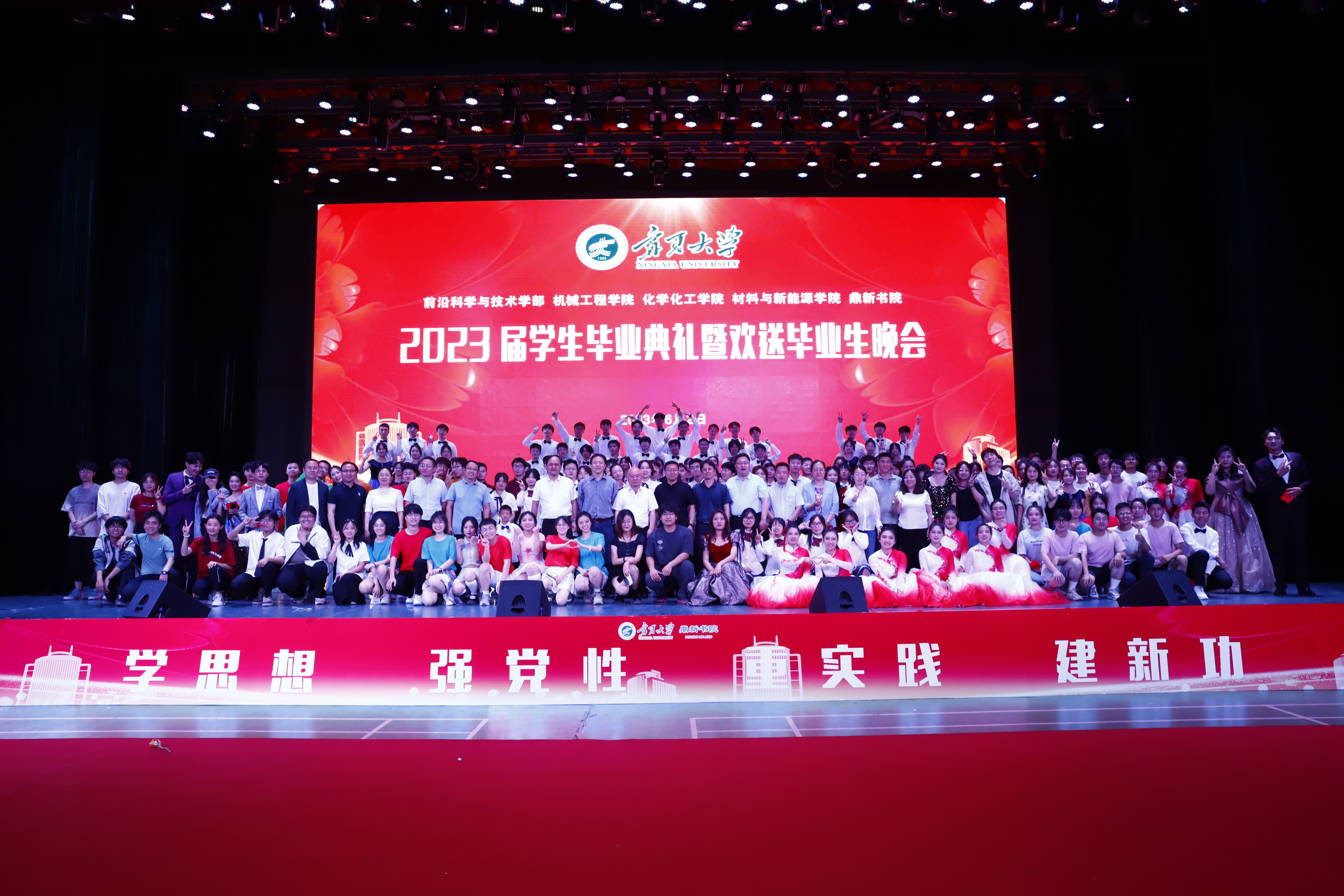 校党委常委、副校长黄河,中国工程院院士、校学术委员会名誉主任、机械工程学院院长、前沿科学与技术学部部长马玉山,校党委学习贯彻习近平新时代中国特色社会主义思想主题教育指导组、学校职能部门领导,康师傅银川分公司人资处相关负责人,以及前沿科学与技术学部、机械工程学院、化学化工学院、材料与新能源学院、鼎新书院各办公室、中心、系、支部负责人、教师代表,澳门十大信誉网赌大全学生会、兄弟学院、书院团学组织代表,鼎新书院全体在校本科生、研究生2000余人参加了毕业典礼暨欢送毕业生晚会。