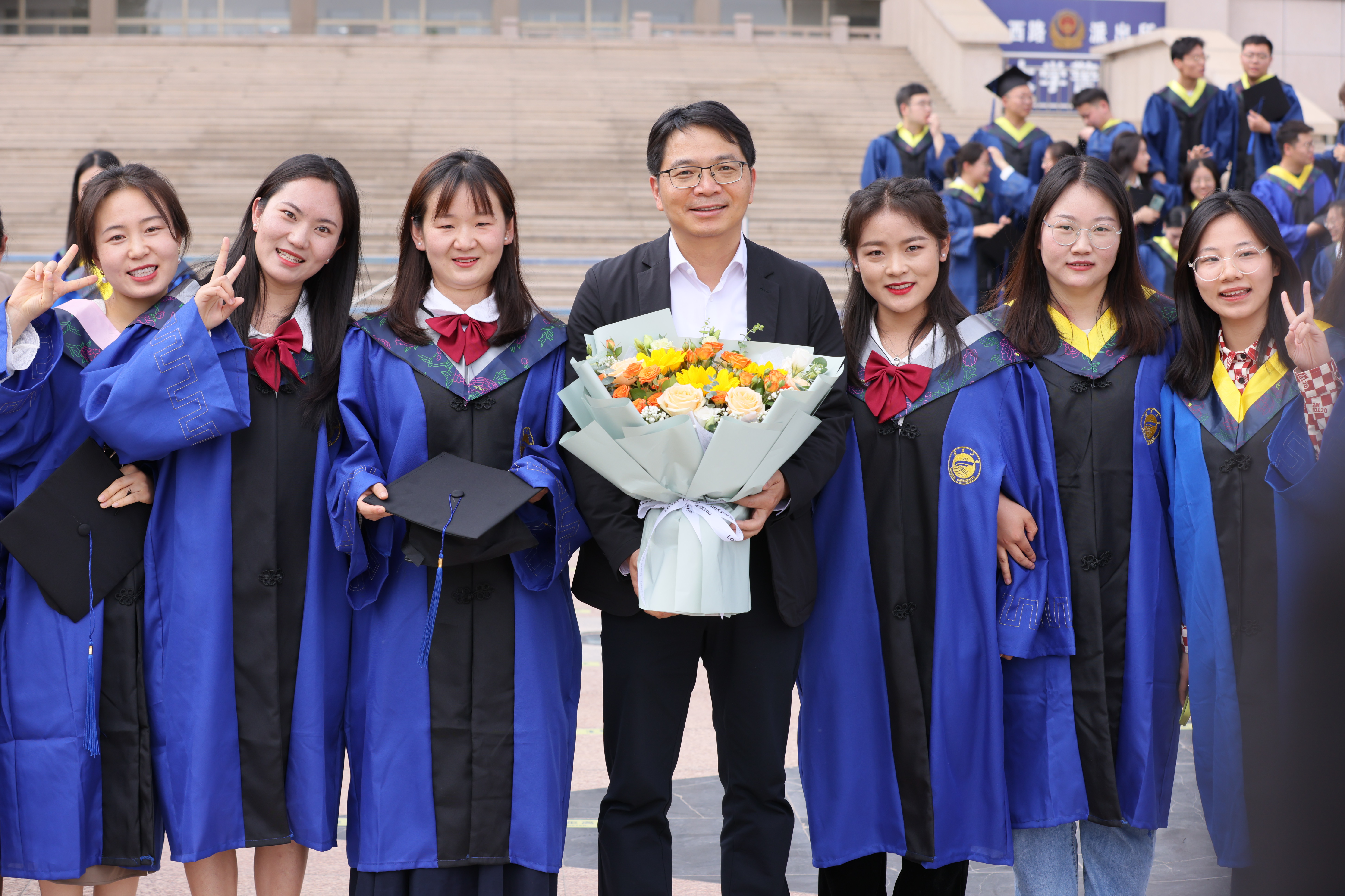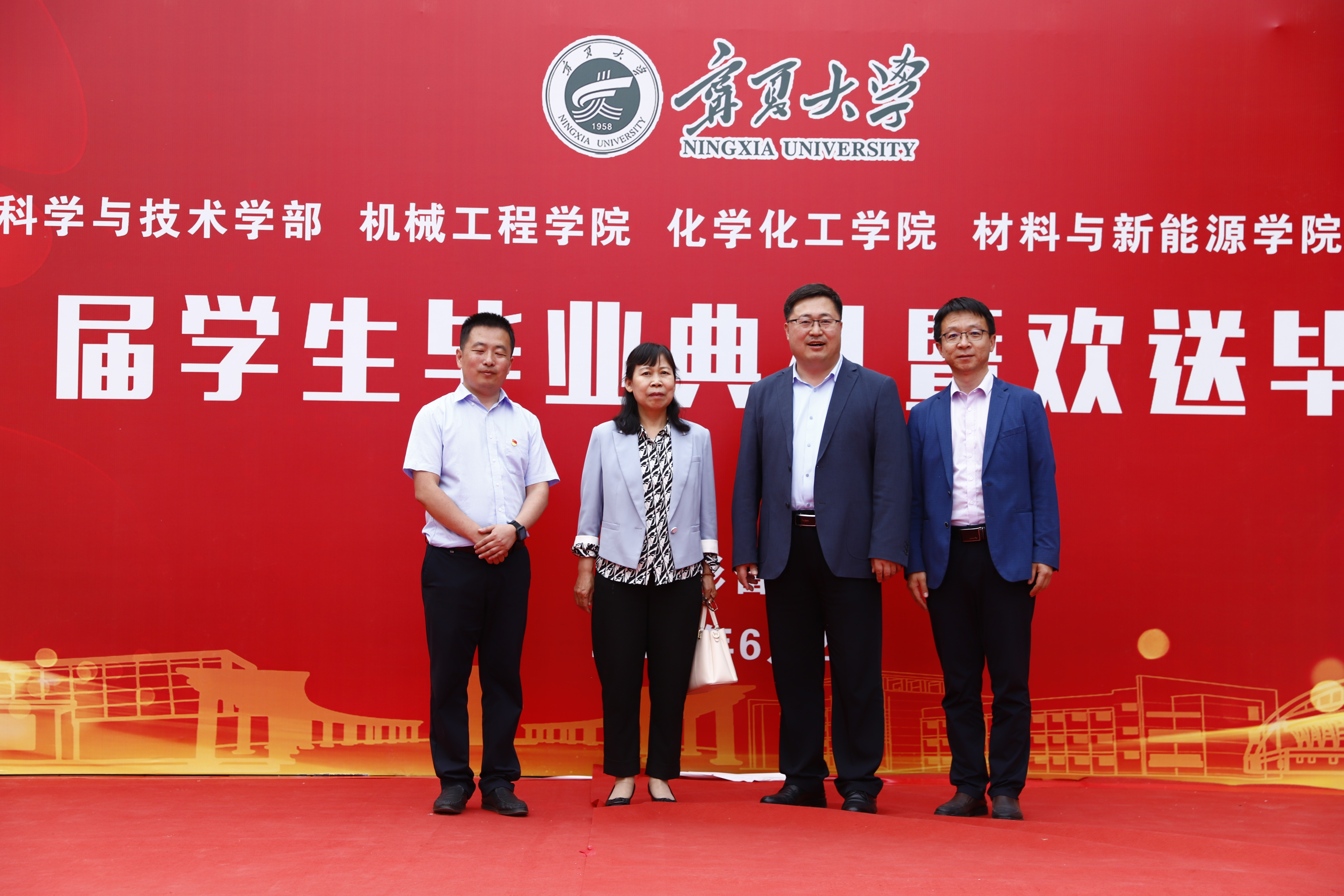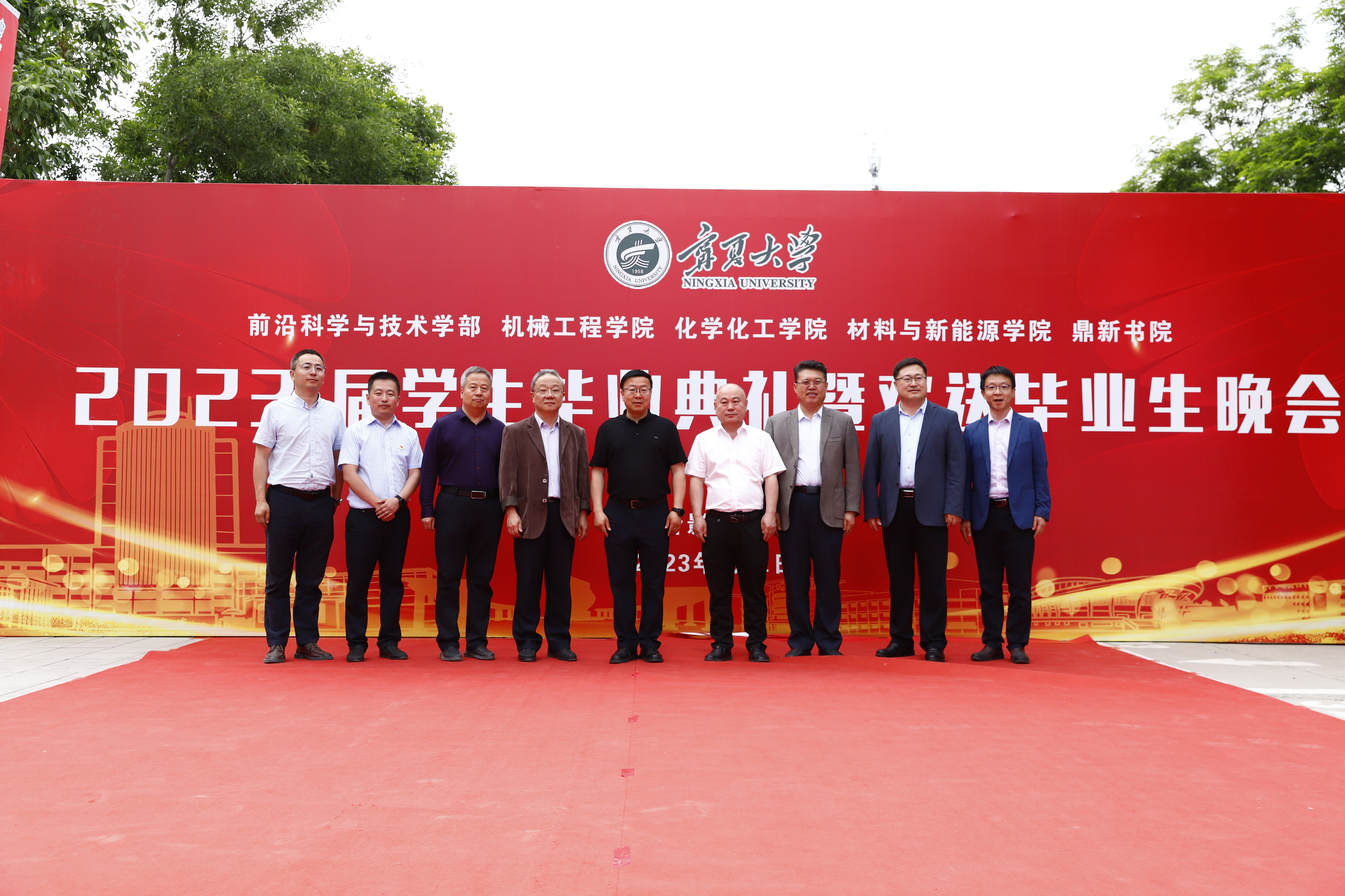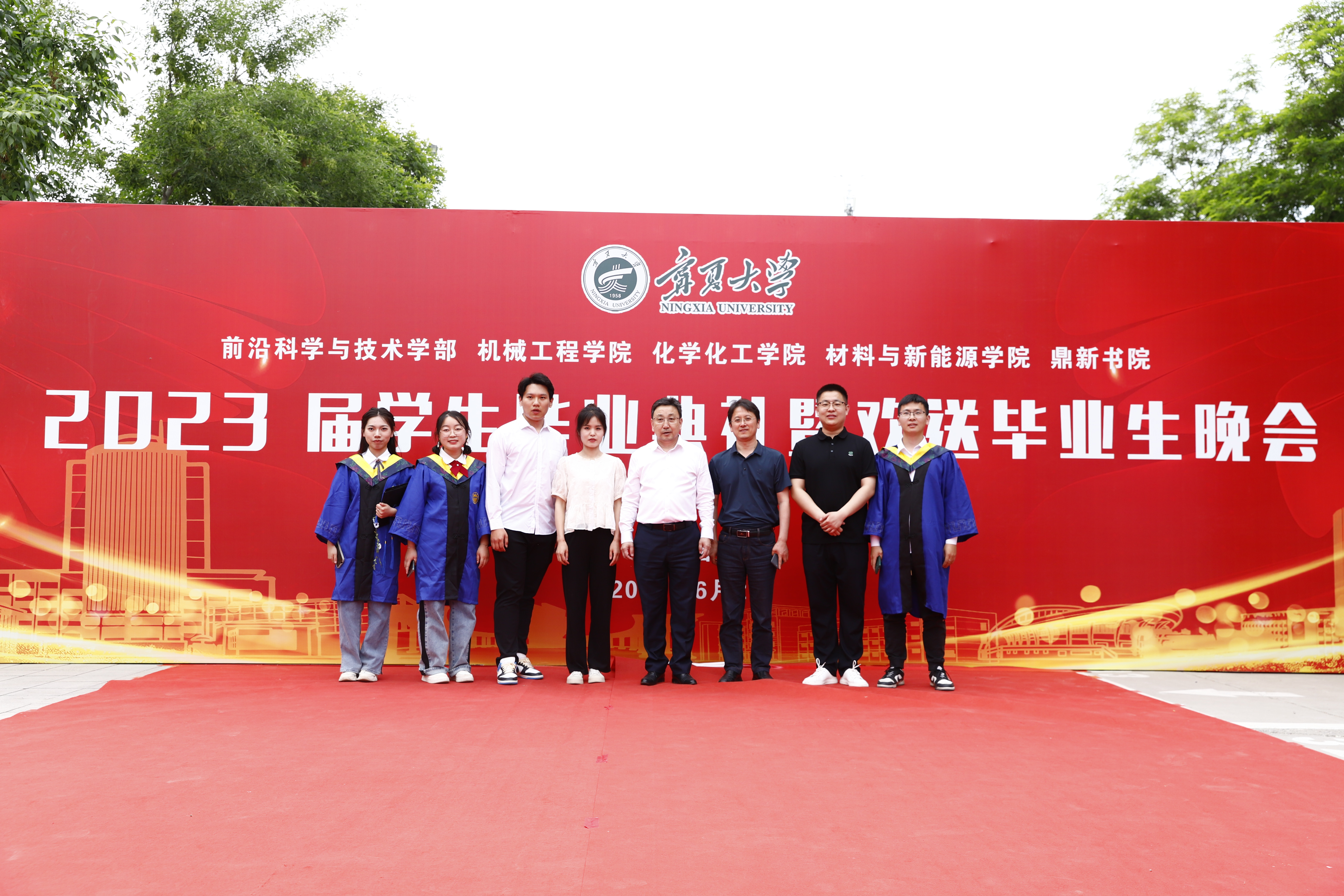 校党委副书记、校长彭志科在贺兰山校区德勤楼前与机械工程学院、化学化工学院、材料与新能源学院毕业生合影留念。