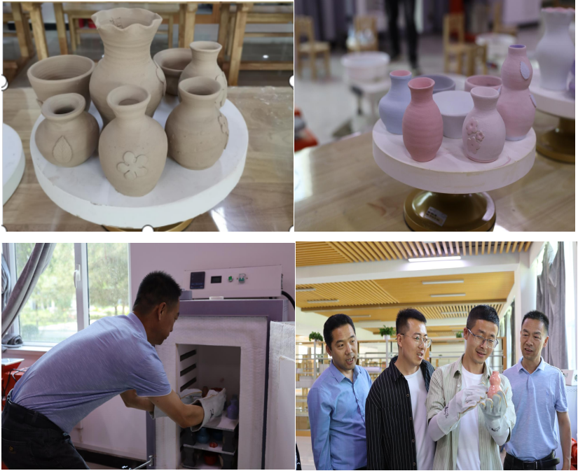 最后,同学们在陶艺老师的指导下自主制作陶艺,通过揉、捏、团、拍等手法,并结合自己的想法与灵感,经修坯、晾坯、上釉等一系列操作后,将一堆堆松软普通的泥土创作成了一件件别具特色的陶艺作品。