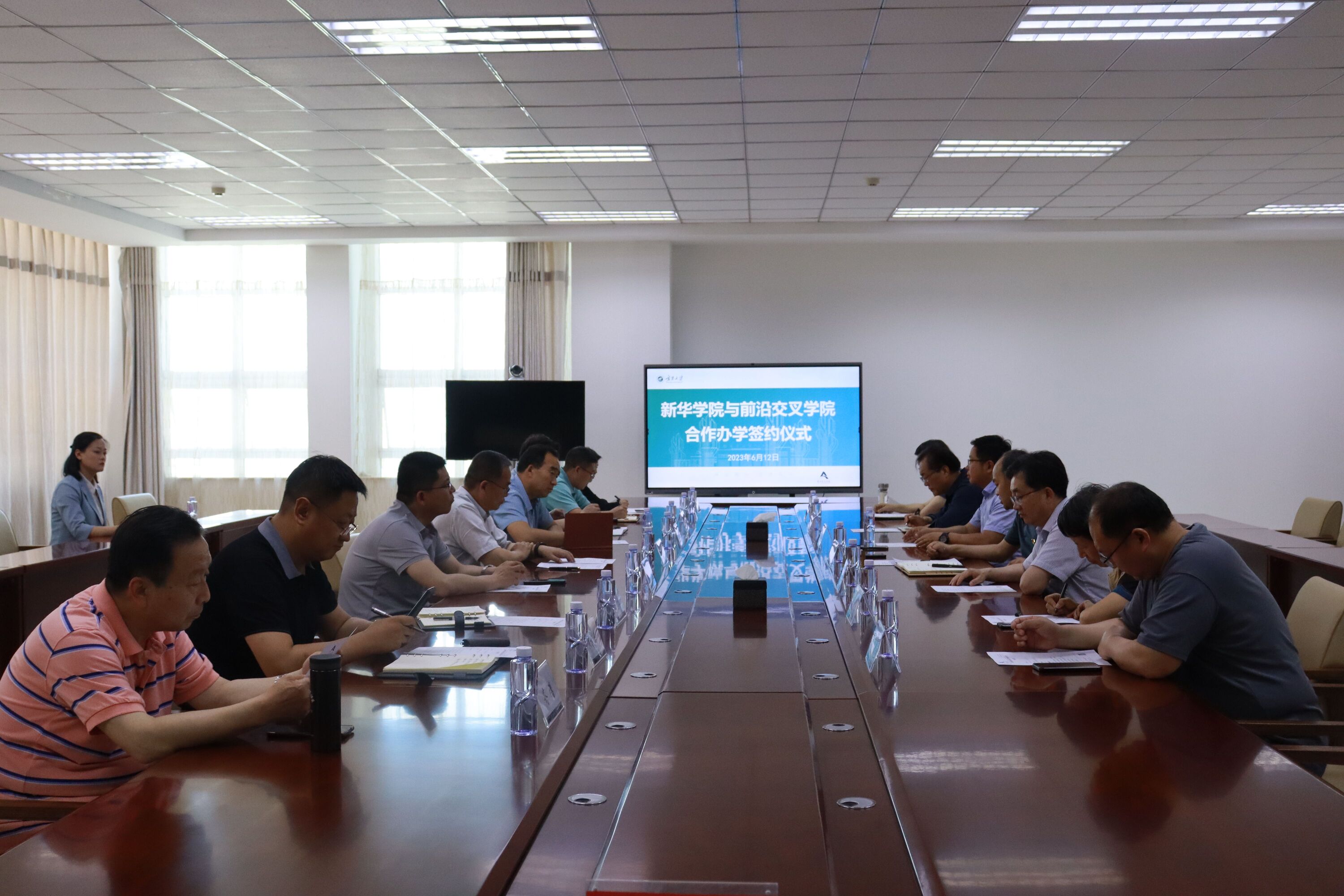 【澳门十大信誉网赌大全新闻中心讯 前沿交叉学院】为进一步整合办学资源,实现跨校区联动,创新合作办学机制,6月12日下午,新华学院党委书记、政府督导员杨文刚,党委副书记、常务副院长罗进德等一行莅临我院就双方合作办学事宜座谈签约。前沿交叉学院党总支书记任磊,党总支副书记、执行院长王磊,博雅书院党委书记张翼等相关领导参加会议,签约仪式由王磊主持。