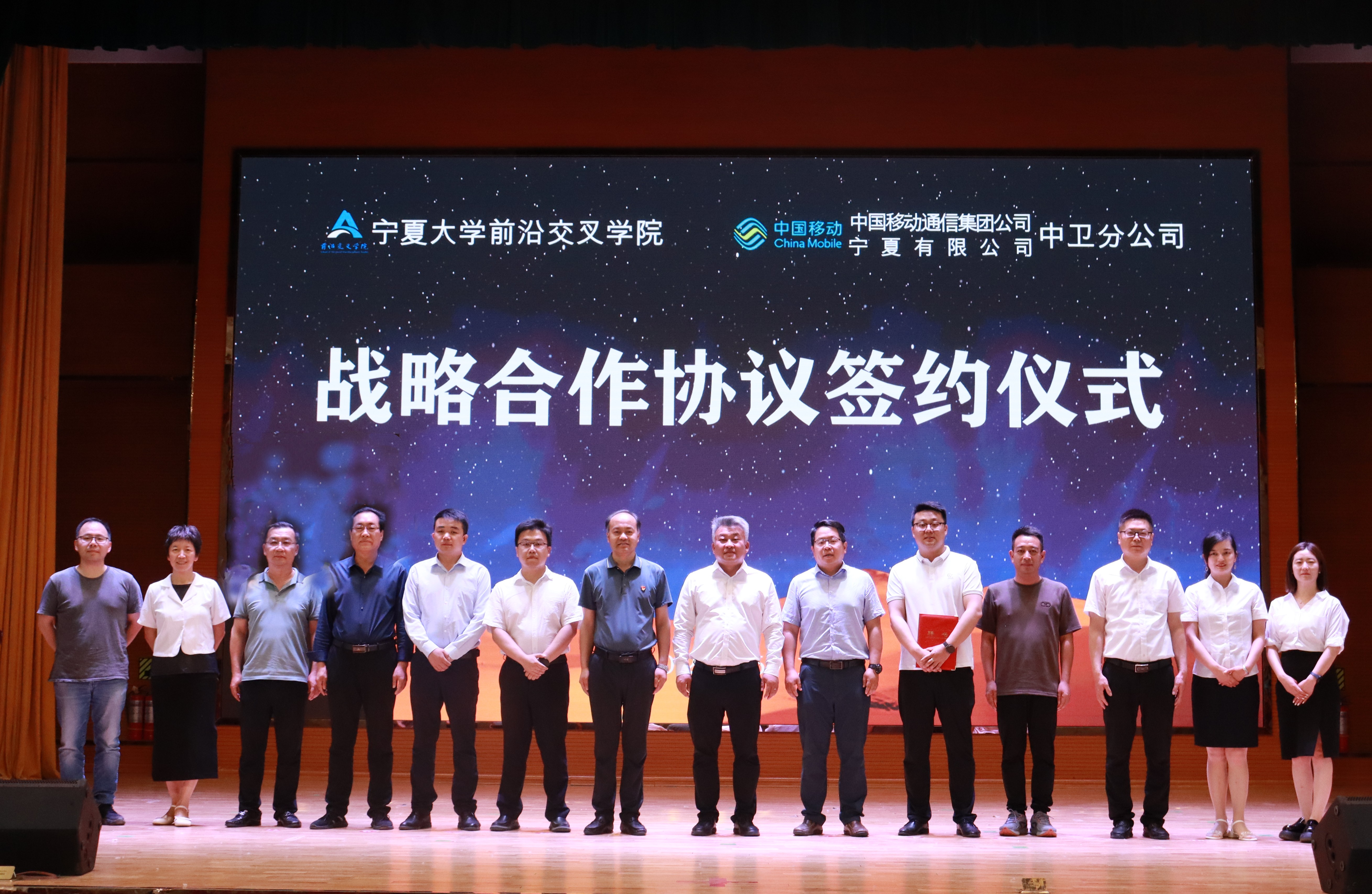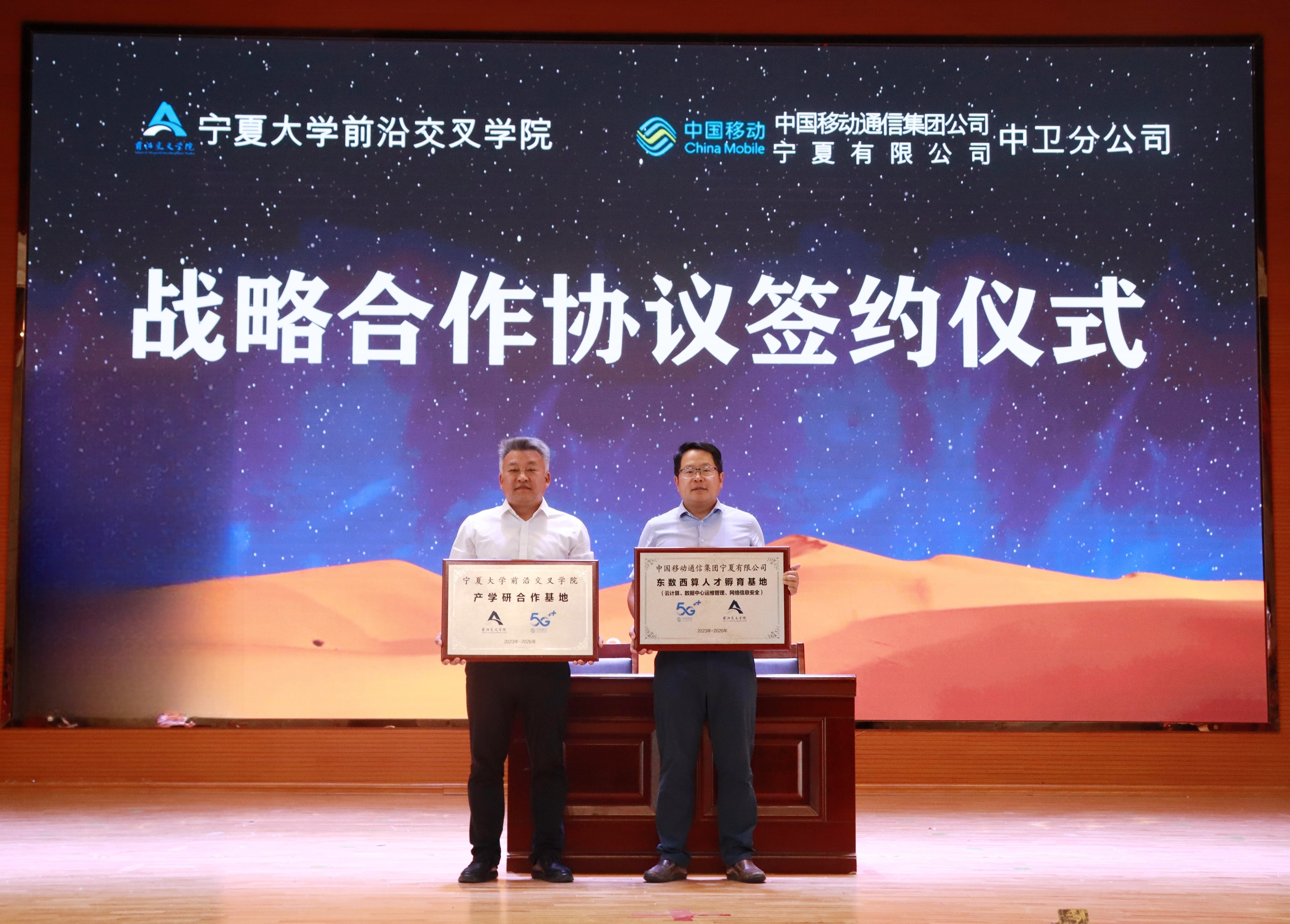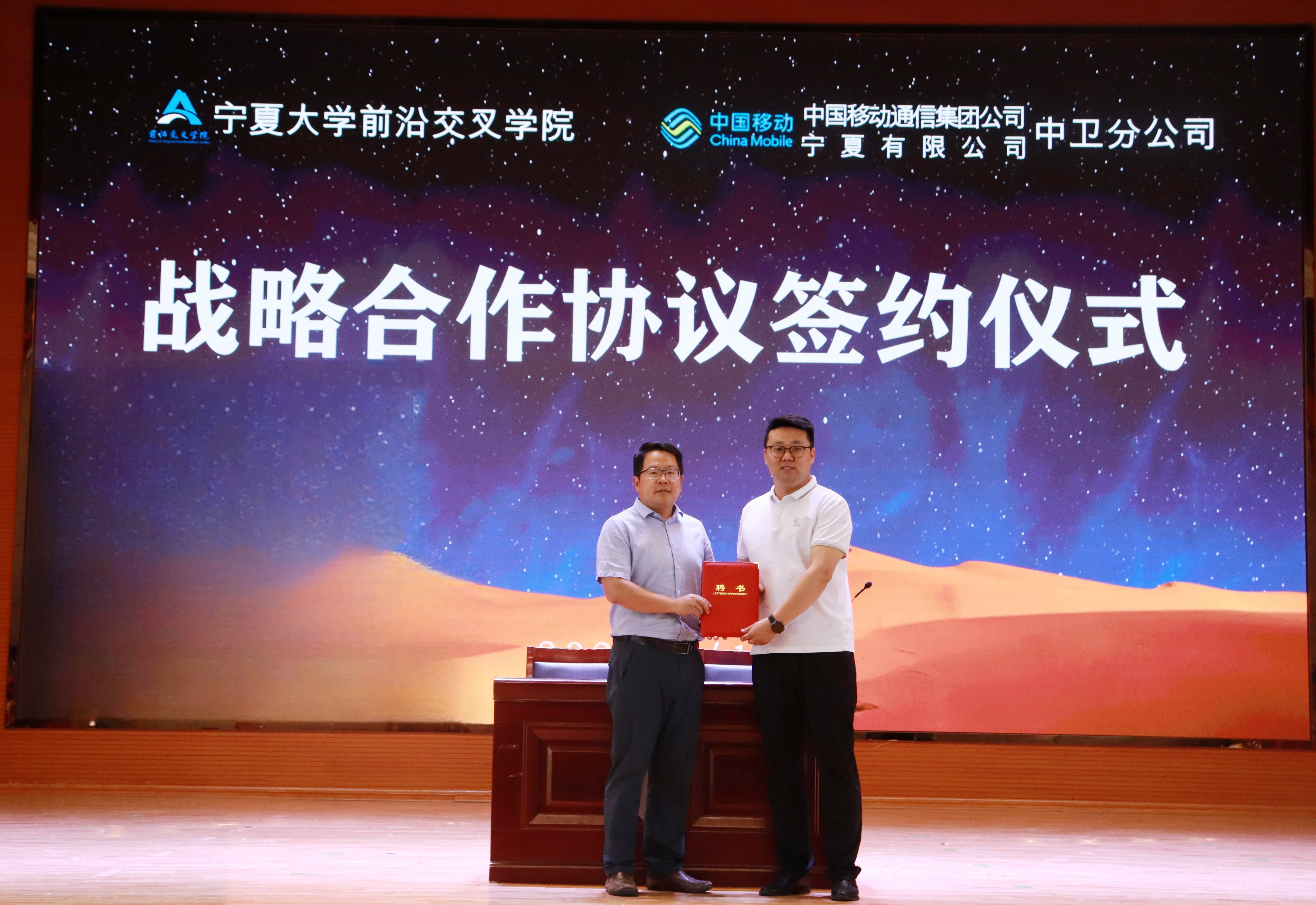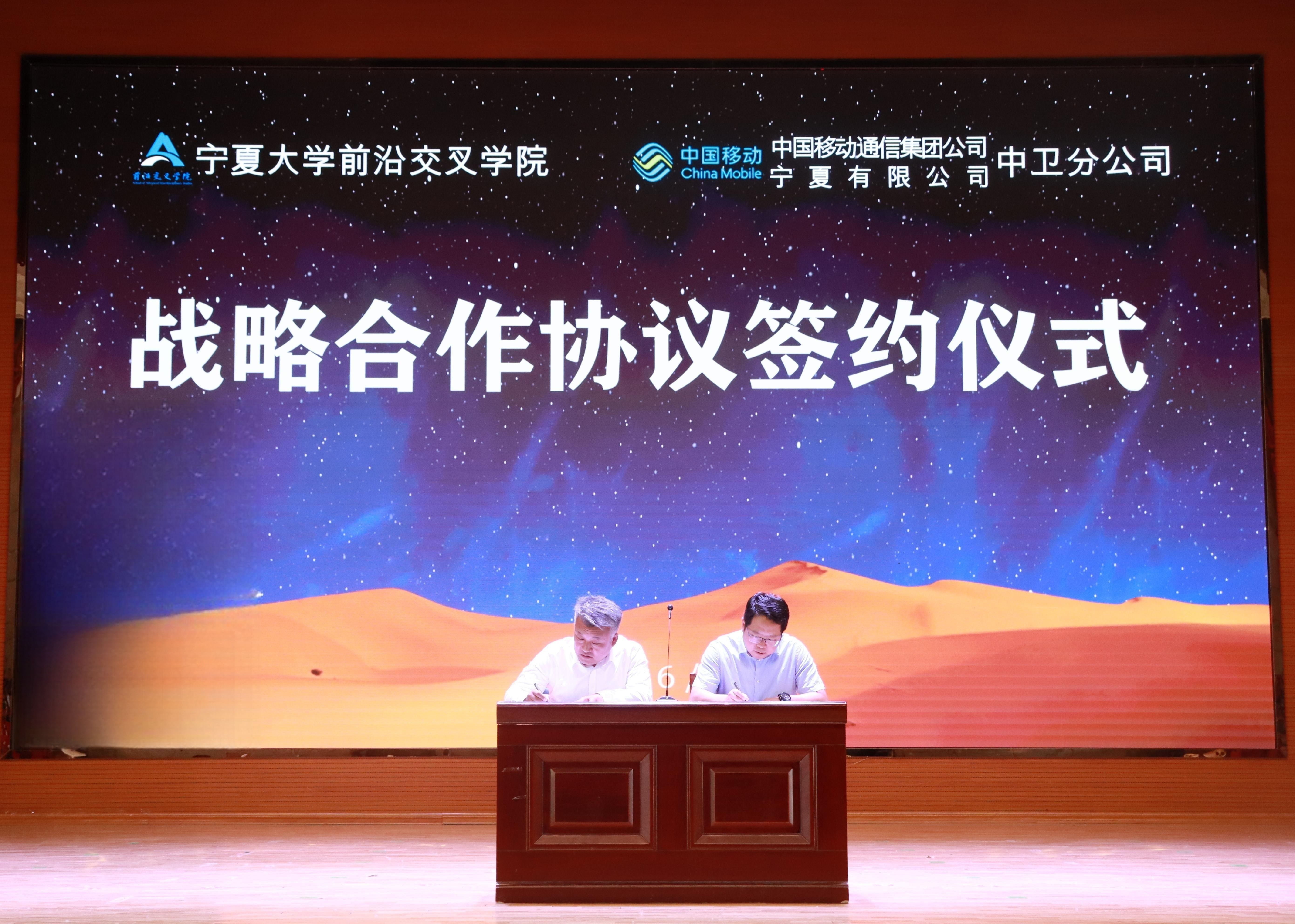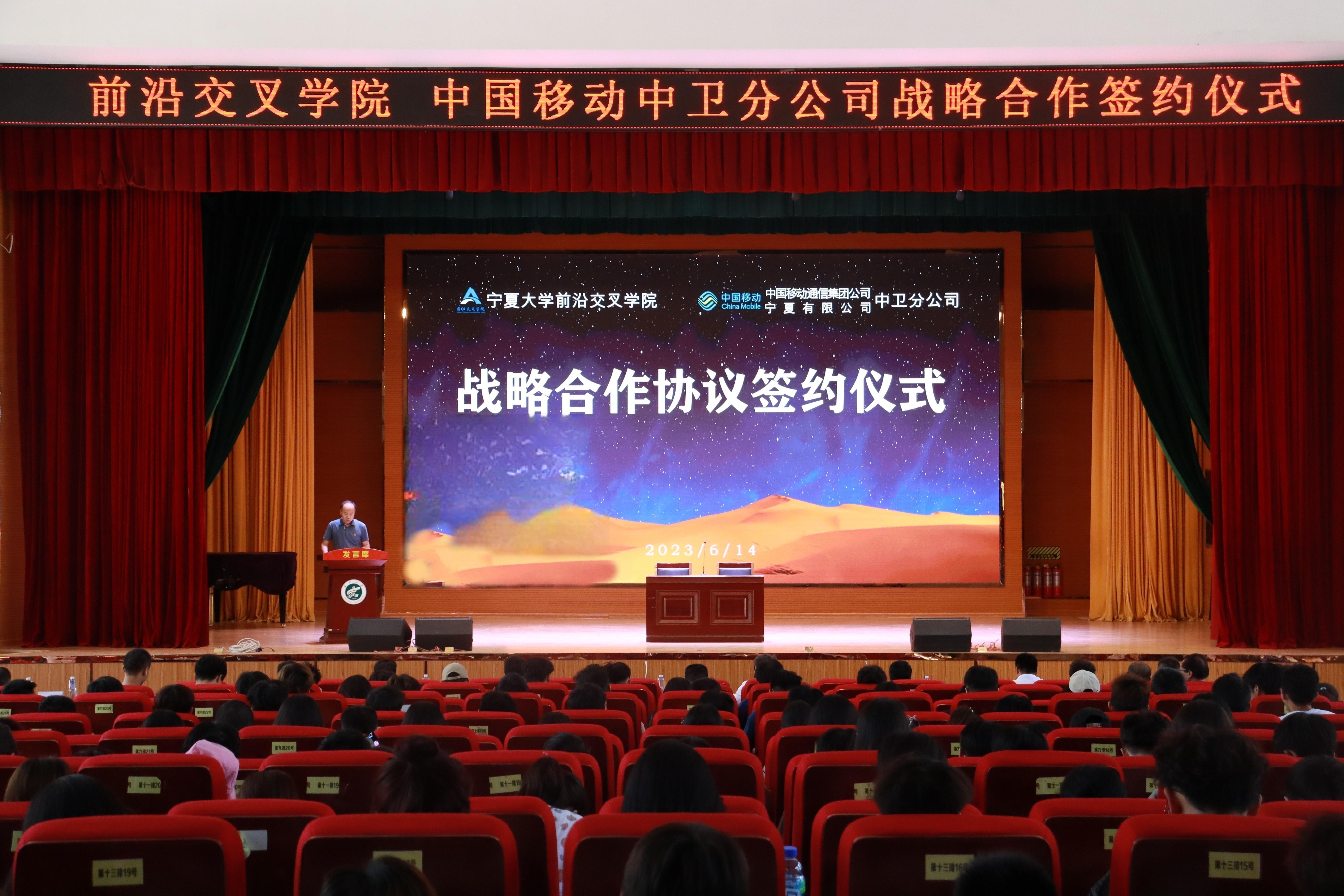【澳门十大信誉网赌大全新闻中心讯 前沿交叉学院】为深化校企合作,共建政产学研用为一体的高层次人才培育基地、创新项目孵育基地、5G+智慧校园示范基地,创新人才培养模式,提高人才培养质量。6月14日下午,前沿交叉学院与中国移动通信集团宁夏有限公司中卫分公司战略合作协议签约仪式在中卫校区应理报告厅隆重举行。中国移动通信集团宁夏有限公司中卫分公司党委书记、总经理唐红涛,副总经理宗伟,宁夏启明星辰信息安全技术有限公司技术总监路磊,前沿交叉学院党总支书记任磊,党总支副书记、执行院长王磊等领导及学院师生400余人参加了本次签约仪式。签约仪式由刘玉奇老师主持。