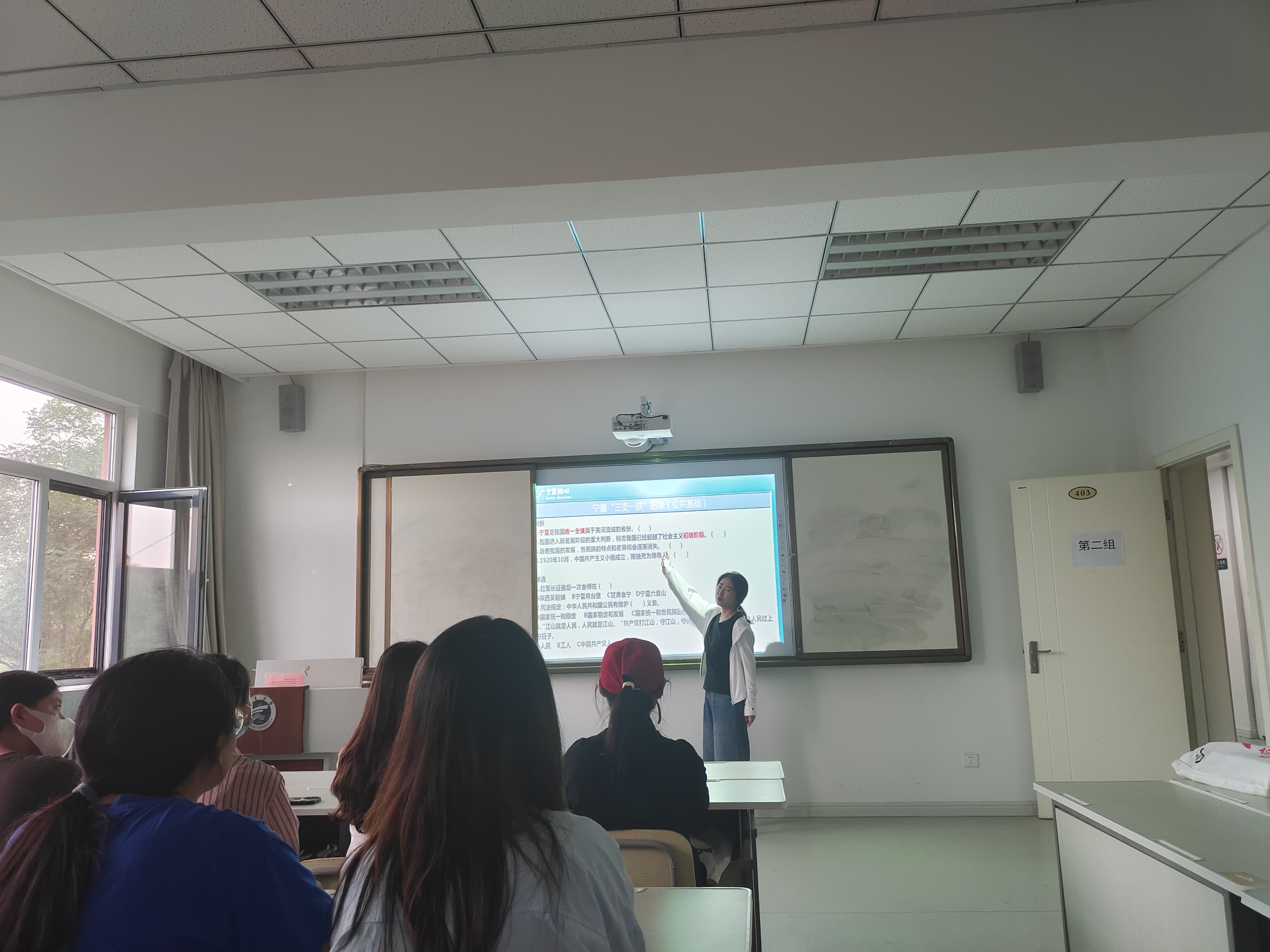 讲座开始,童铃抛出“你们参加过哪些考试?为什么有些人能考那么高?他们的分数有什么特点?”三个问题,由此引发学生对于以往参加国考、省考相关考试的思考。童铃对“三支一扶”的典型题目进行了说明,强调在接下来的考试中要尤为重视总结经验,吸取教训。关于“三支一扶”,童铃以宁夏2022年高校毕业生招录情况为例,梳理了笔试公告、笔试报名、笔试考试、笔试成绩发布、资格复审等一系列时间,介绍了“三支一扶”如何报考、加分政策、优惠政策待遇、服务类型等基本情况,提醒同学们要根据自身情况来选择支农、支教、支医三种类型。另外童铃也提醒学生,由于不同区县招聘公告发布时间节点的不同,要尤为注意教育、卫健、司法等部门的官方信息、在报考期间个人电话号码不要随意更换等注意事项。