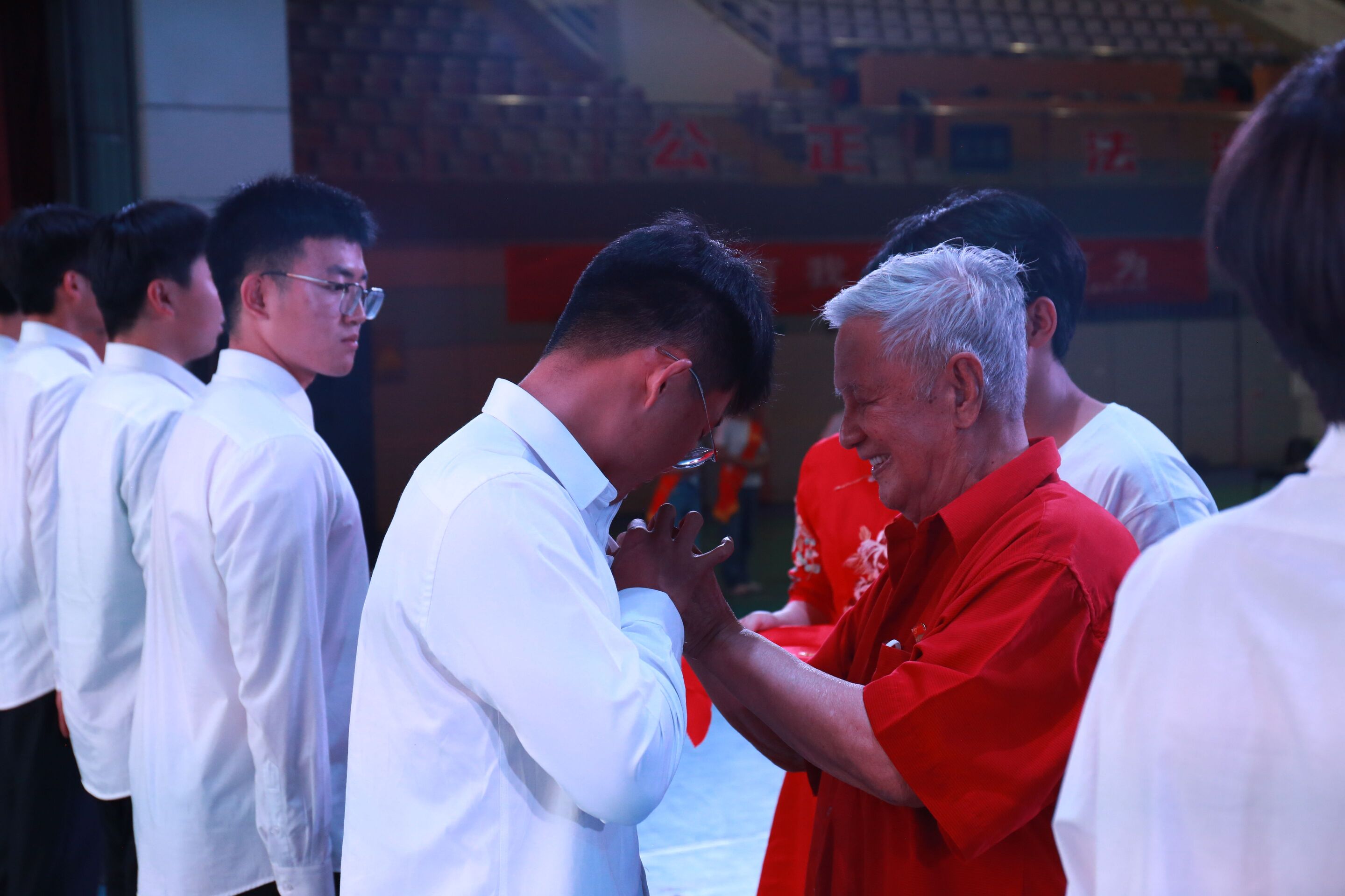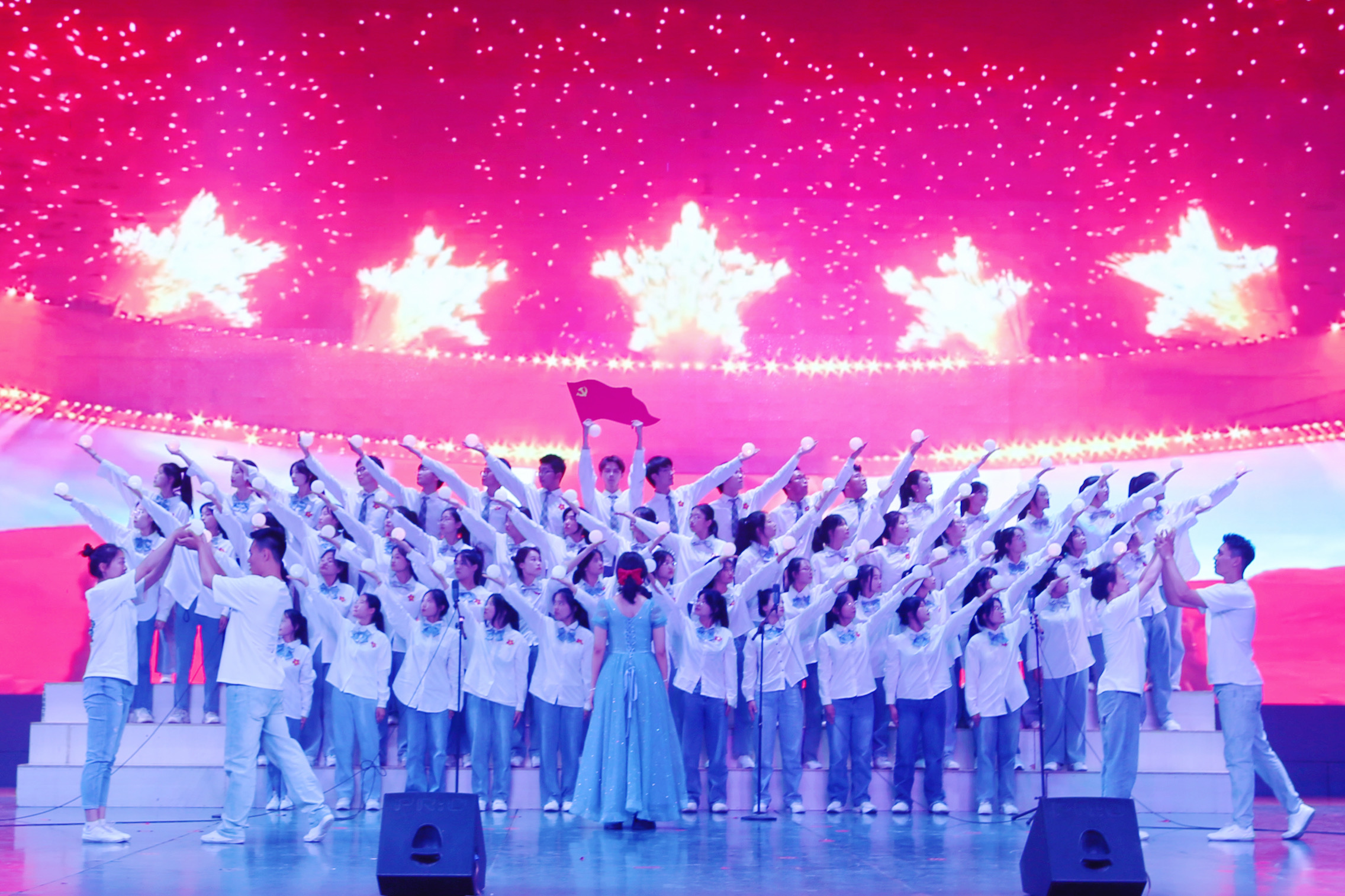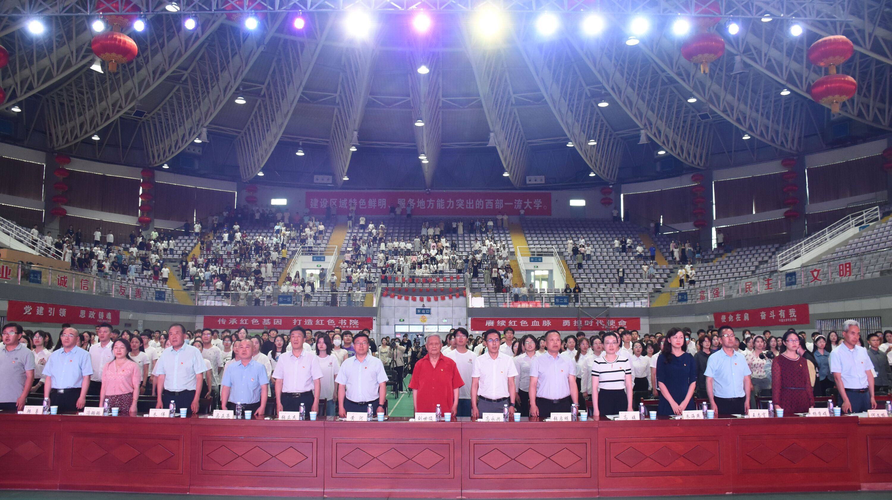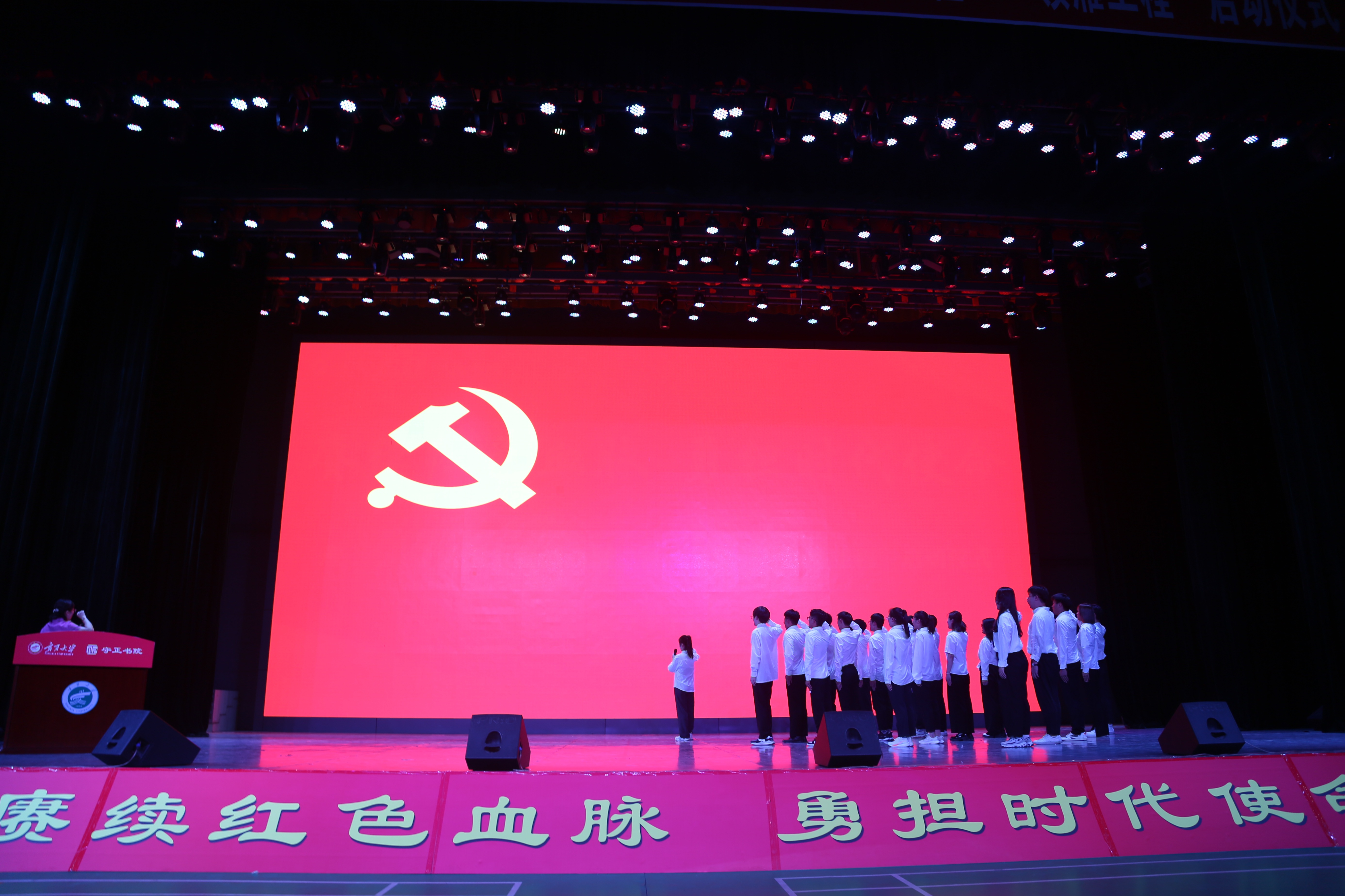 与会领导为新一批入党学生佩戴党徽,全体党员面向党旗进行入党宣誓。
