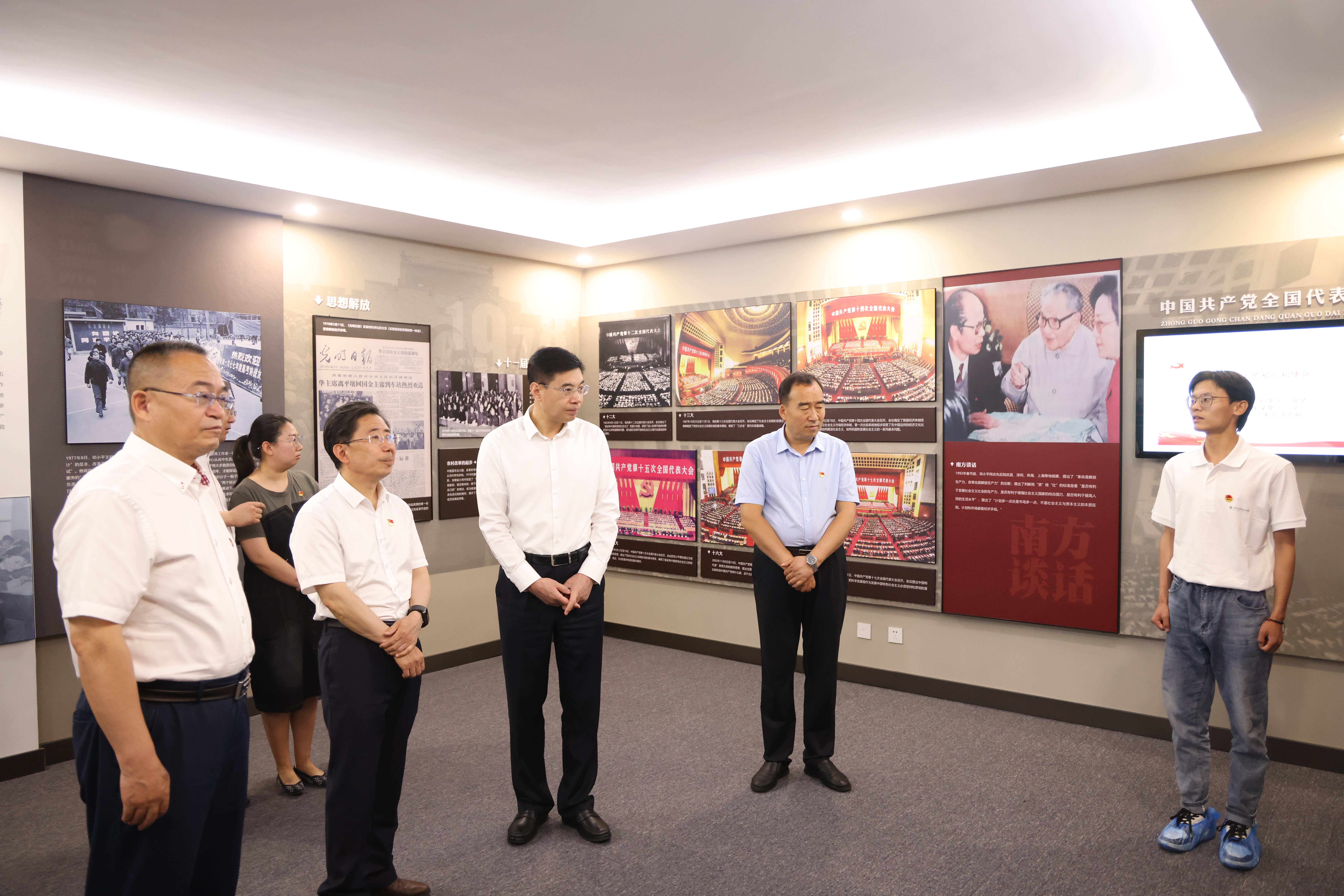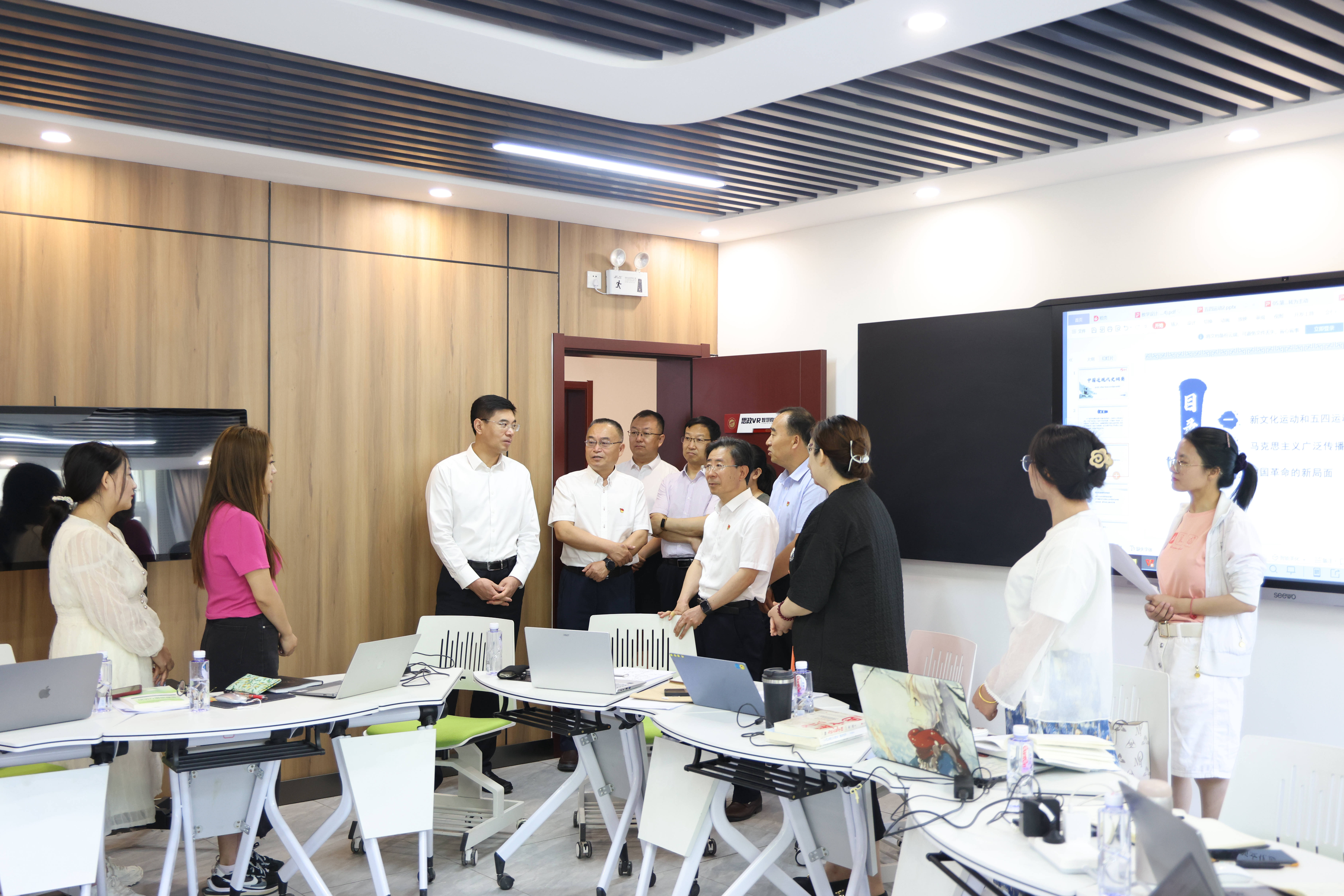 李金科一行先来到宁夏高校红色文化教育研究中心,在学生讲解员的引导下,沿着百年党史脉络,参观跨越历史的红色展品,聆听荡气回肠的红色故事,领略中国共产党在各个时期不懈奋斗的历史和取得的辉煌成就。李金科一行还来到马克思主义教学科研部教研室,与正在备赛全区“我心中的思政课”教学竞赛的老师进行交流。