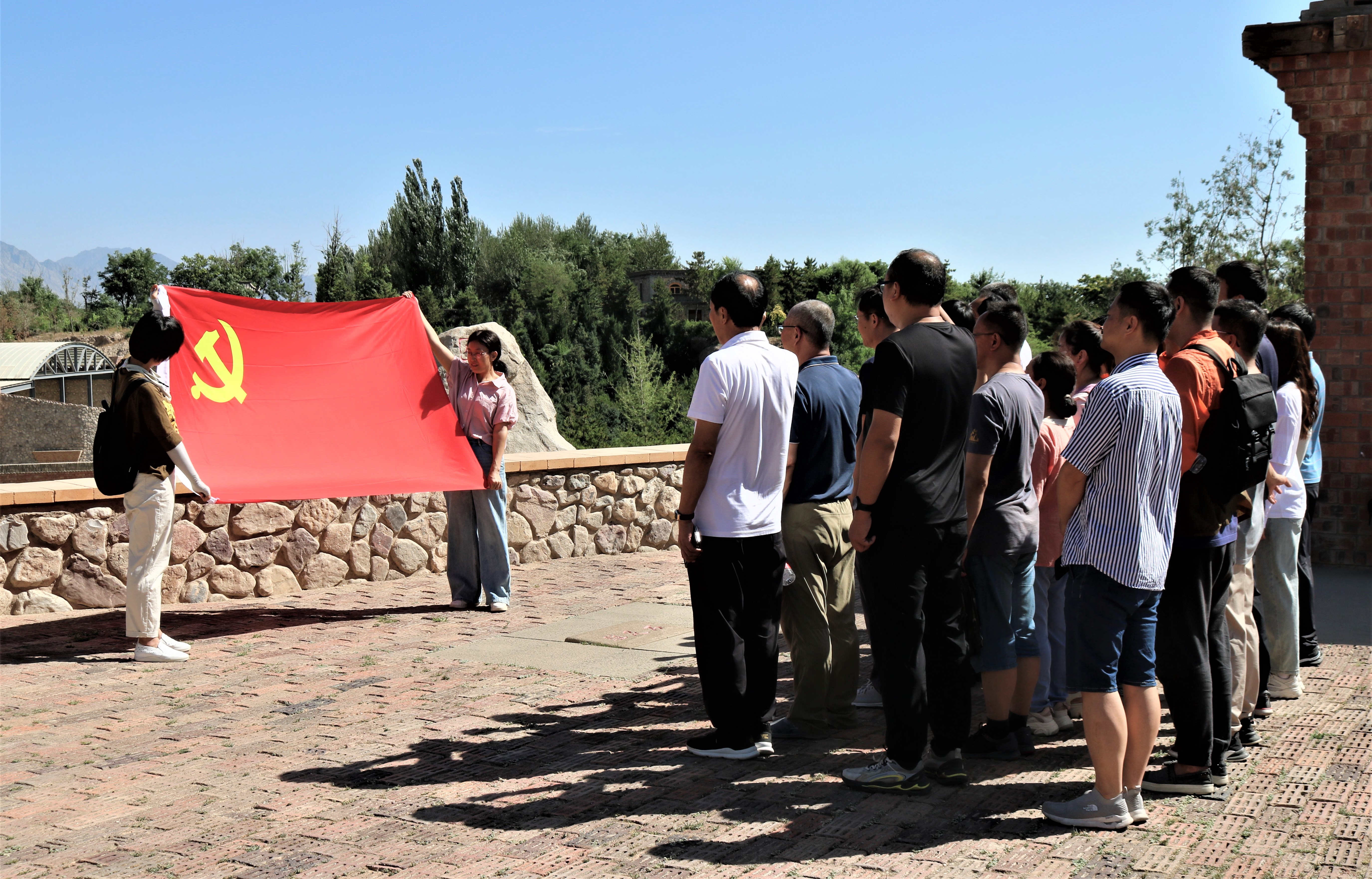 站在驻足石前,面对鲜红的党旗,学院党总支书记何彦平带领全体党员老师一起高举右手,再次庄严宣誓。