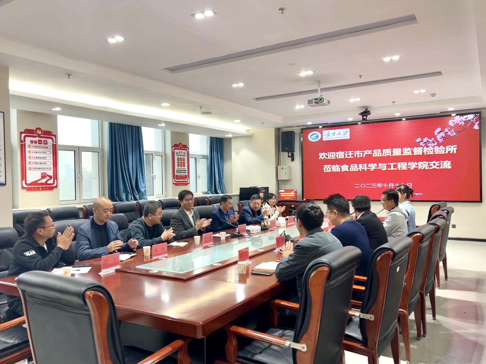 【澳门十大信誉网赌大全新闻中心讯 食品科学与工程学院】10月17日,宿迁市产品质量监督检验所交流会暨澳门十大信誉网赌大全食品科学与工程学院和江苏省市场监管技术创新中心(酒类食品)战略合作签约仪式顺利举行。宿迁市市场监督管理局副局长、总工程师时猛,产品质量监督检验所所长赵裕祥一行与食品科学与工程学院院长刘源、副书记李文华及部分青年教师参加座谈交流。
