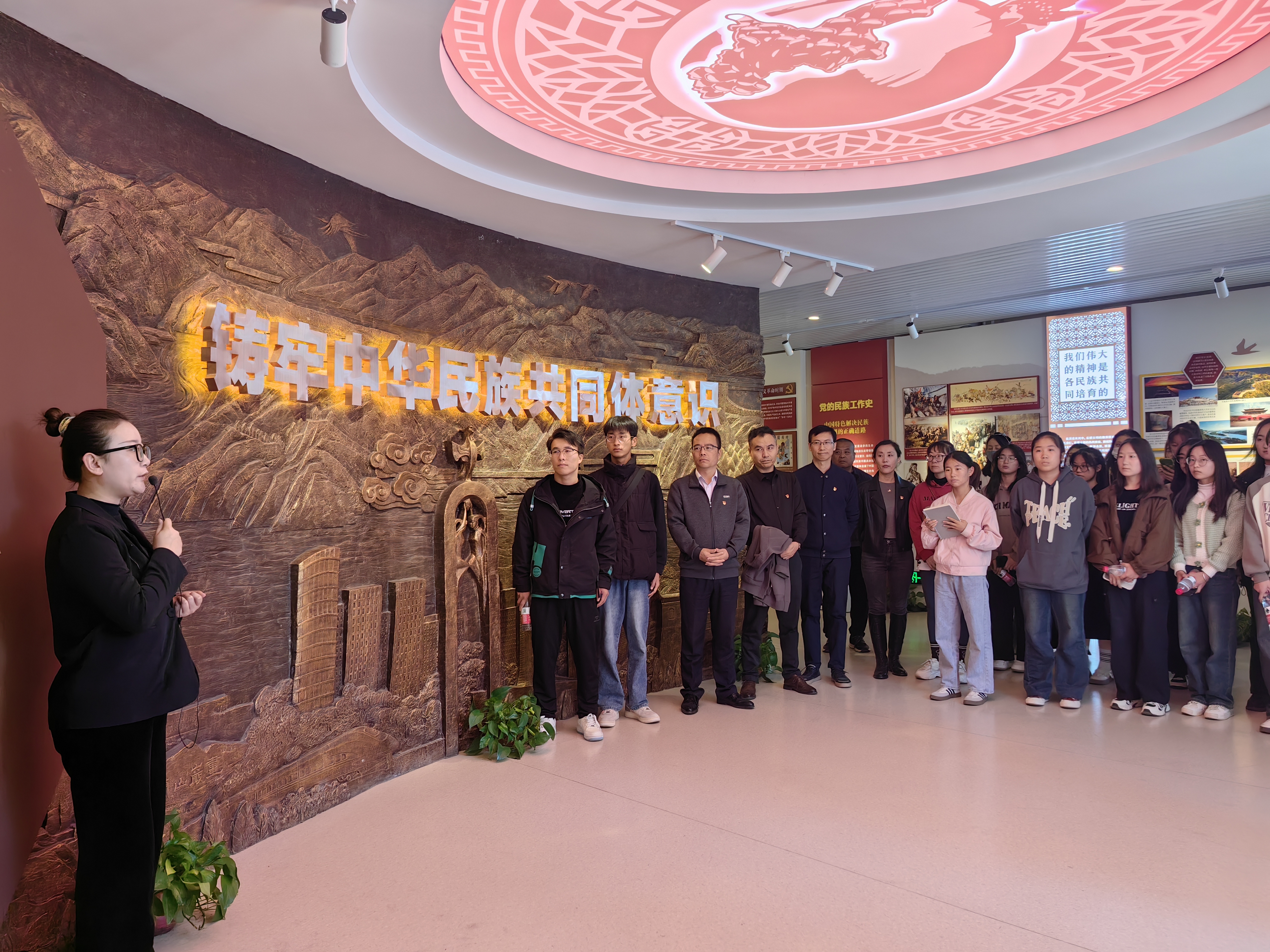 参观伊始,讲解员通过对“铸牢中华民族共同体意识”“树立正确核心价值观”“党的民族工作史”“打造铸牢中华民族共同体意识示范市”的介绍,重温了党的民族工作史,回顾了红军西征在宁夏的故事和宁夏回族自治区成立的历次庆祝活动,让大家深刻理解铸牢中华民族共同体意识的意义。通过参观展览、互相交流等形式更加深入了解了民族团结进步教育重要性。